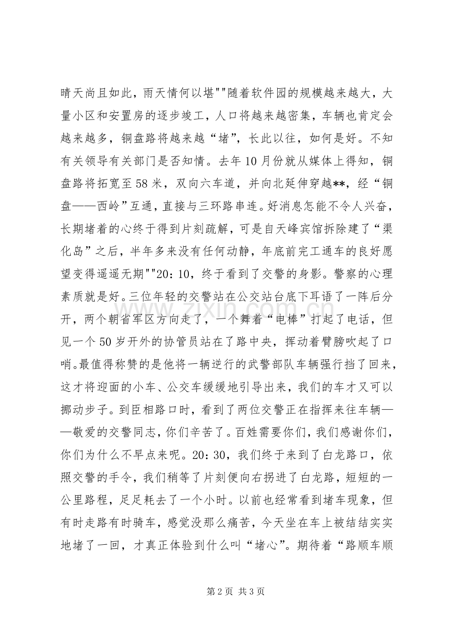 车堵路堵心更堵近几年来,**的市政道路建设一直未停,二环改造提速、绕城高速开通、三环即将闭合,打通断头路、开建地铁等等,可以说是天天在施工,年年大变样。我作为**的一位普通市民,感受很深,打心眼里感到高兴和欣慰。但众所周知,**市拥堵的通病也是**市区交通的顽疾,大有愈演愈烈之势,二环的几个路口特别明显,铜盘路口便是其中之一。傍晚19:30,天气晴好,炎夏的高温尚未退却,因有事要办,便临时叫车去一趟白龙路的省军区老干部活动中心。一出省军区大门,只见“车如流水马如龙”,一公里多的路面“竟成车国”,估计“堵车”已经好久了。刚开始,车还可缓慢爬行,行至琵琶山小区时就彻底走不动了,隐隐约约看见臣相路口有几辆车“头对着头身贴着身”互不相让,有几个人大声地叫喊着相互指责。我们规规矩矩地靠右行驶,但是后面的几辆车硬是占着来方车道拼命地往前挤,原本还有几台车零零星星地开过来,现在也被卡死了,仅存的一点希望之火彻底熄灭。铜盘路天峰至省军区段道路宽约28米,只有俩机动车道俩非机动车道,但有好几个丁字路口,其中白龙路、臣相路路口是最容易引发堵车的关节点。时至20:00,车子仍纹丝未动,我的心开始变得焦躁不安,一个接一个的疑问随之而来:交警到哪去了呢。假如有急诊病人怎么办。假如有突发情况怎么办。驻扎在附近的部队有重大战备行动,如何去执行任务。晴天尚且如此,雨天情何以堪""随着软件园的规模越来越大,大量小区和安置房的逐步竣工,人口将越来越密集,车辆也肯定会越来越多,铜盘路将越来越“堵”,长此以往,如何是好。不知有关领导有关部门是否知情。去年10月份就从媒体上得知,铜盘路将拓宽至58米,双向六车道,并向北延伸穿越**,经“铜盘——西岭”互通,直接与三环路串连。好消息怎能不令人兴奋,长期堵着的心终于得到片刻疏解,可是自天峰宾馆拆除建了“渠化岛”之后,半年多来没有任何动静,年底前完工通车的良好愿望变得遥遥无期""20:10,终于看到了交警的身影。警察的心理素质就是好。三位年轻的交警站在公交站台底下耳语了一阵后分开,两个朝省军区方向走了,一个舞着“电棒”打起了电话,但见一个50岁开外的协管员站在了路中央,挥动着臂膀吹起了口哨。最值得称赞的是他将一辆逆行的武警部队车辆强行挡了回来,这才将迎面的小车、公交车缓缓地引导出来,我们的车才又可以挪动步子。到臣相路口时,看到了两位交警正在指挥来往车辆——敬爱的交警同志,你们辛苦了。百姓需要你们,我们感谢你们,你们为什么不早点来呢。20:30,我们终于来到了白龙路口,依照交警的手令,我们稍等了片刻便向右拐进了白龙路,短短的一公里路程,足足耗去了一个小时。以前也经常看到堵车现象,但有时走路有时骑车,感觉没那么痛苦,今天坐在车上被结结实实地堵了一回,才真正体验到什么叫“堵心”。期待着“路顺车顺心更顺”的时刻早日到来。行笔至此,提几点建议: