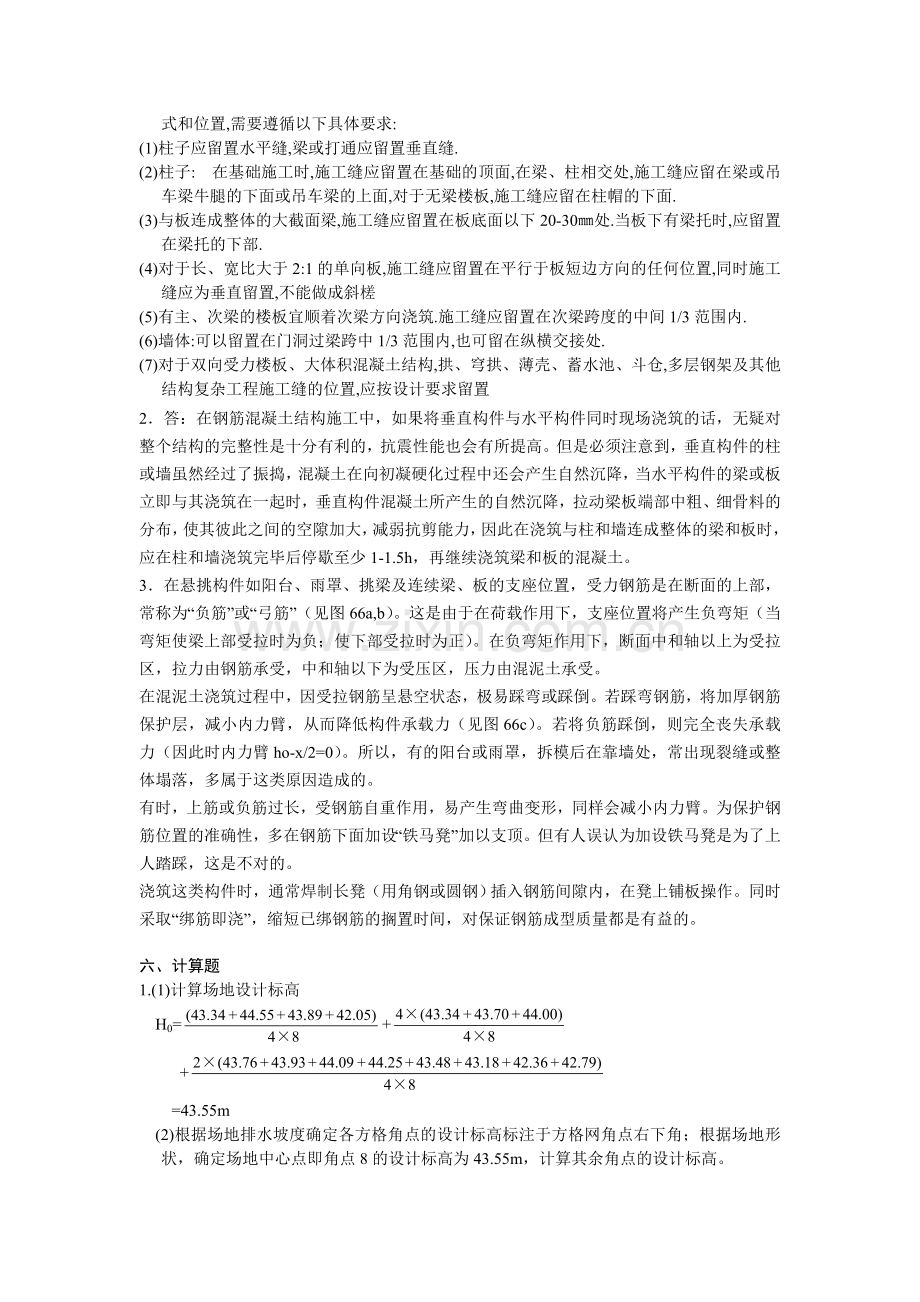 2.答:在钢筋混凝土结构施工中,如果将垂直构件与水平构件同时现场浇筑的话,无疑对整个结构的完整性是十分有利的,抗震性能也会有所提高。但是必须注意到,垂直构件的柱或墙虽然经过了振捣,混凝土在向初凝硬化过程中还会产生自然沉降,当水平构件的梁或板立即与其浇筑在一起时,垂直构件混凝土所产生的自然沉降,拉动梁板端部中粗、细骨料的分布,使其彼此之间的空隙加大,减弱抗剪能力,因此在浇筑与柱和墙连成整体的梁和板时,应在柱和墙浇筑完毕后停歇至少1-1.5h,再继续浇筑梁和板的混凝土。