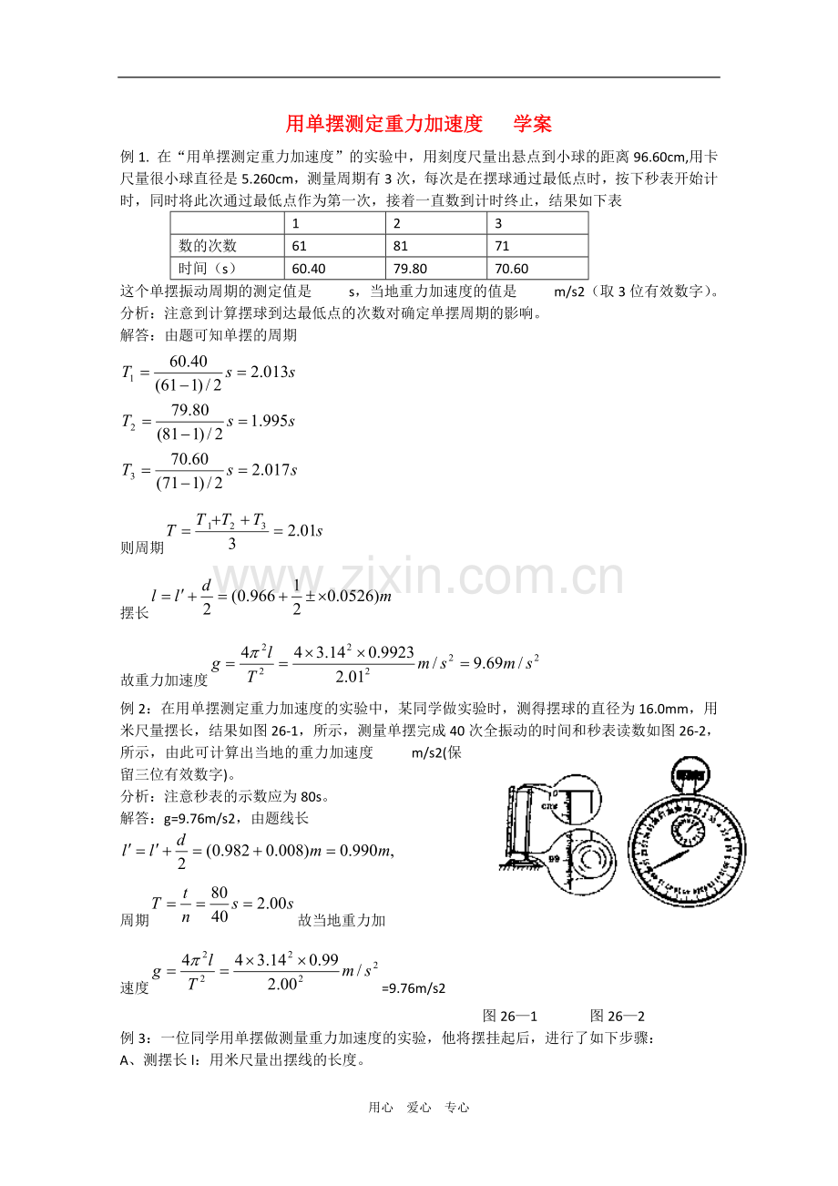 例2:在用单摆测定重力加速度的实验中,某同学做实验时,测得摆球的直径为16.0mm,用米尺量摆长,结果如图26-1,所示,测量单摆完成40次全振动的时间和秒表读数如图26-2,所示,由此可计算出当地的重力加速度 m/s2(保留三位有效数字)。