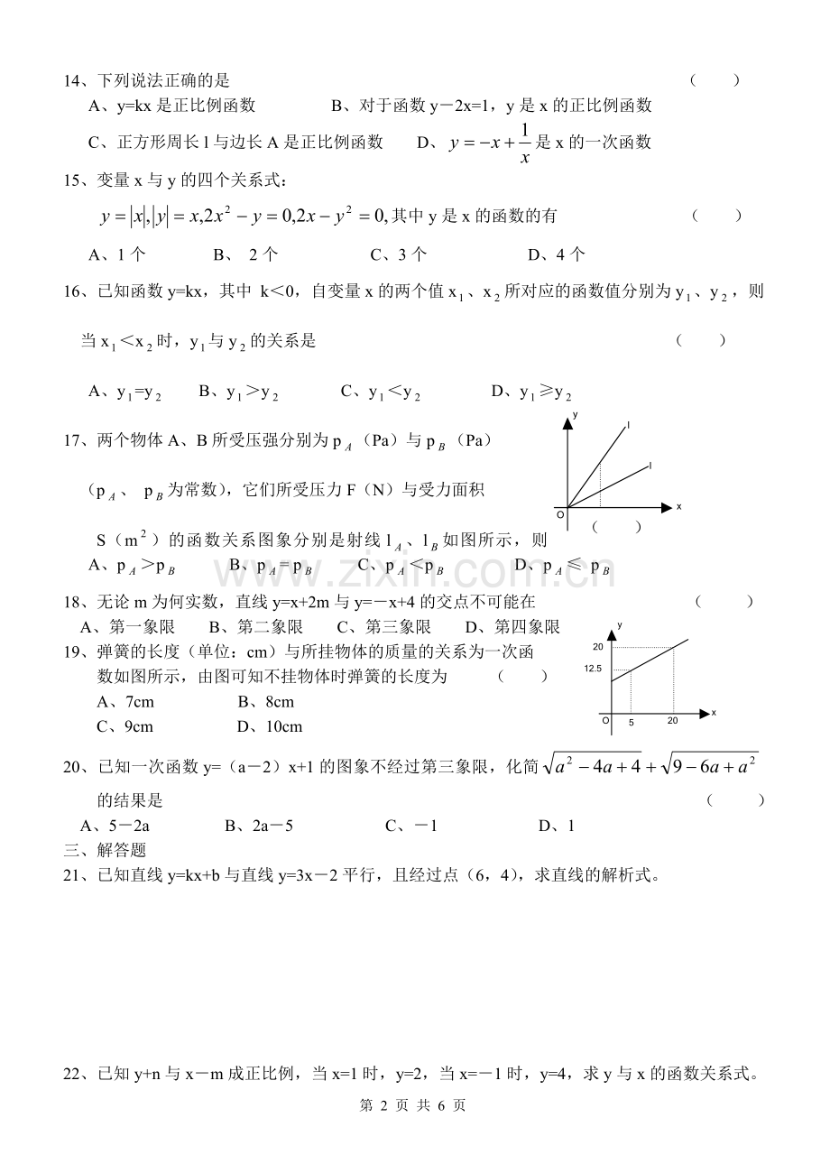 16、已知函数y=kx,其中 k<0,自变量x的两个值x、x所对应的函数值分别为y、y,则当x<x时,y与y的关系是 ( )