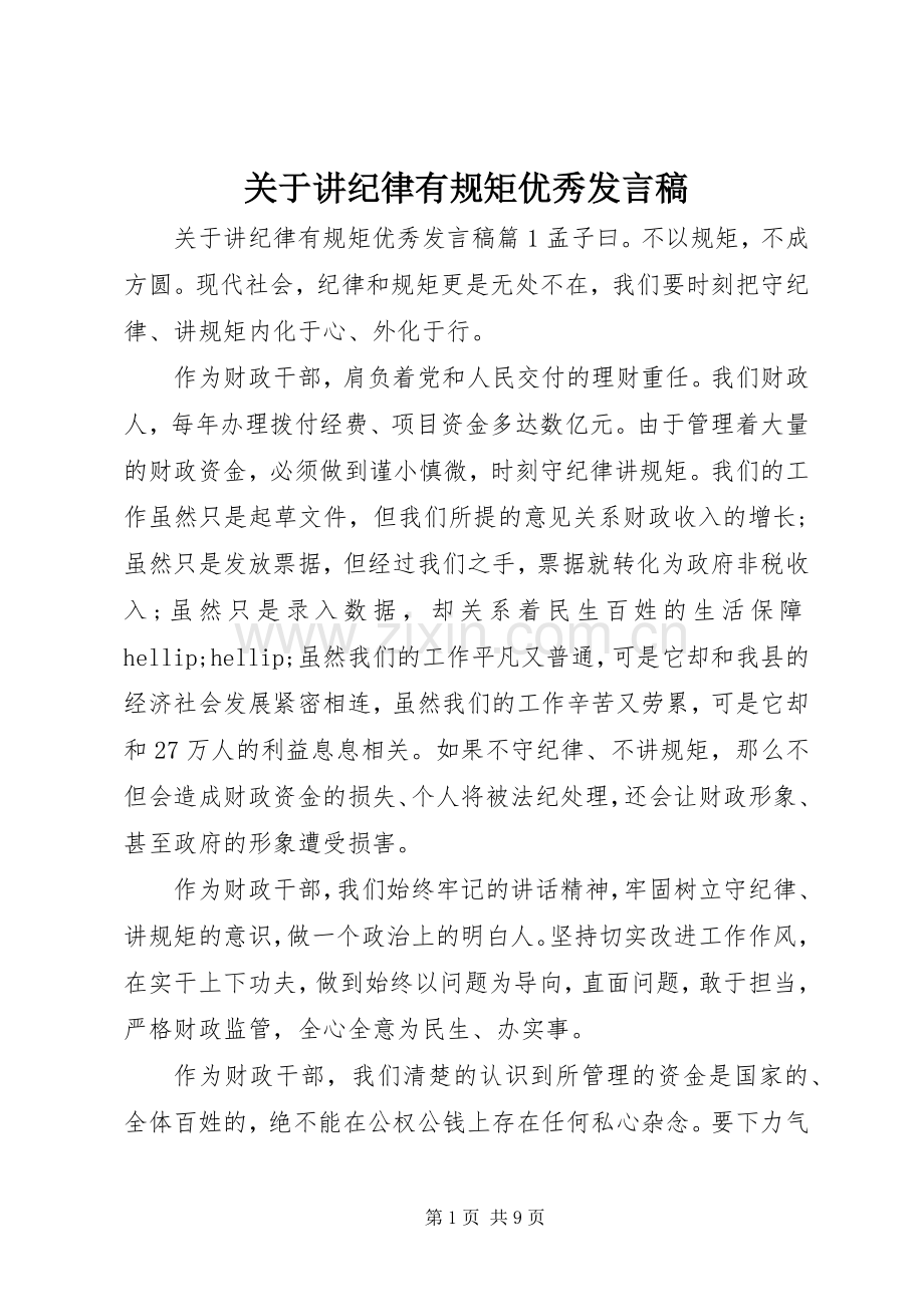 关于讲纪律有规矩优秀发言稿篇2欲知平直,则必准绳;欲知方圆,则必规矩。纪律是党的生命,纪律建设就是治本之策。从严治党、依规治党,加强党的纪律建设,必须把规矩立起来、严起来。
