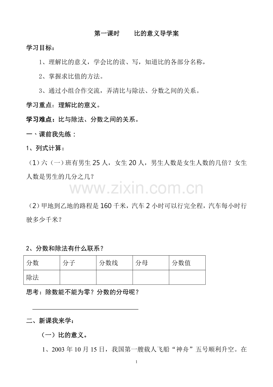 1、理解比的意义,学会比的读、写,知道比的各部分名称,