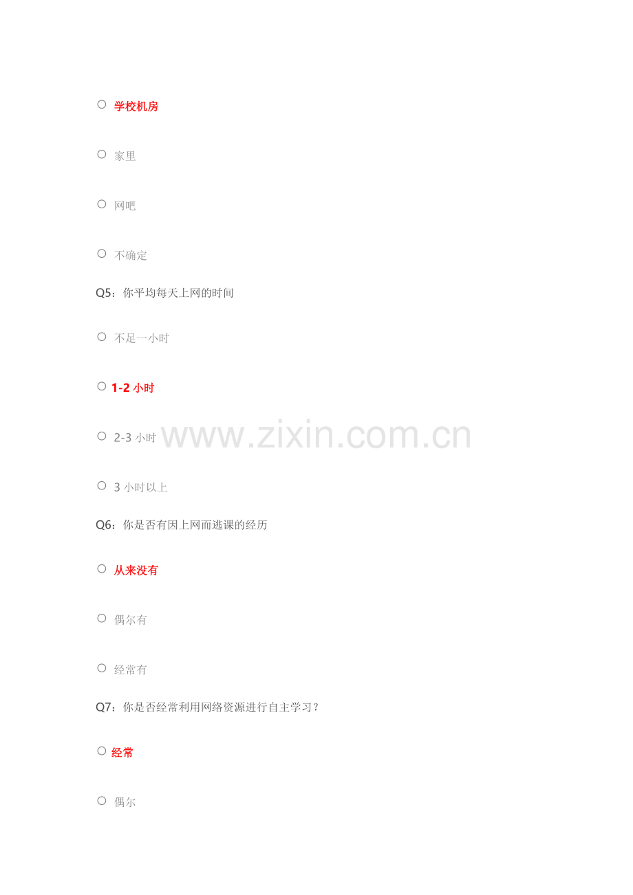 互联网犹如一把双刃剑,既有有益于中学生发展的一面,也有危害中学生身心健康的一面。为了更好的了解青少年上网情况,引导青少年健康成长,促进青少年有效的学习,特做此调查,请广大中学生根据自己的实际情况填写。谢谢您的合作!