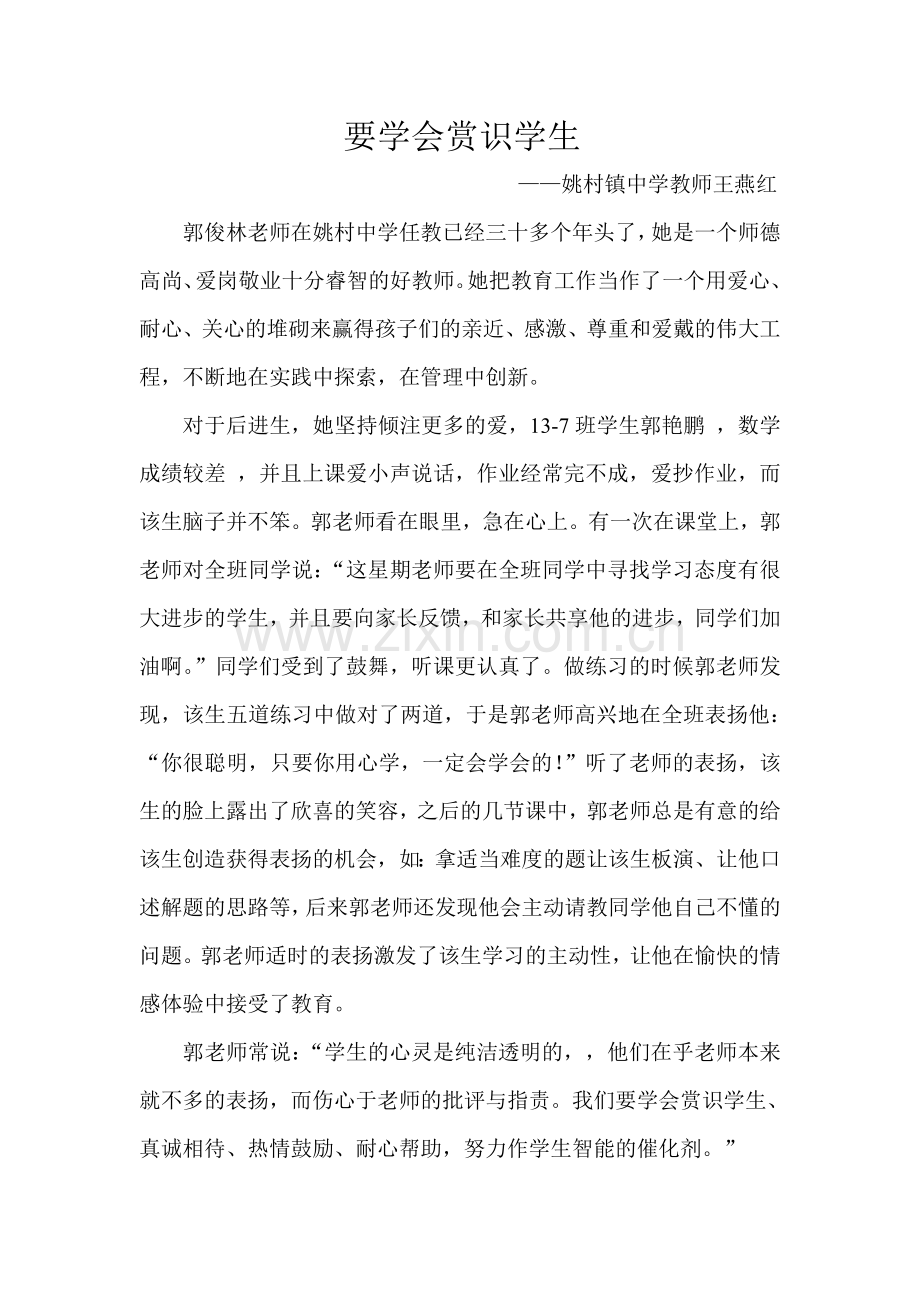 郭老师常说:“学生的心灵是纯洁透明的,,他们在乎老师本来就不多的表扬,而伤心于老师的批评与指责。我们要学会赏识学生、真诚相待、热情鼓励、耐心帮助,努力作学生智能的催化剂。”