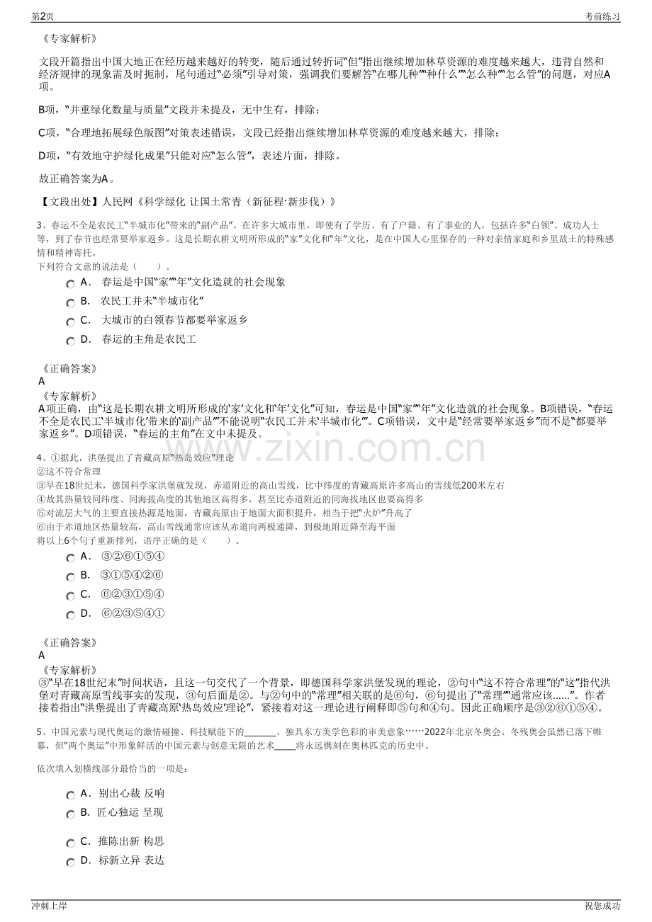 2024年四川峨眉山名城产业集团有限公司招聘笔试冲刺题(带答案解析)【下载须知】:1,本套练习包含以下题型:言语理解与表达题、常识判断题、数量关系题、判断推理题和资料分析题等题型;共135道。2、本套试题根据常见招考题总结归纳,主要用于练习答题思路和拓展知识面。3、本套试题非考试真题,且与四川峨眉山名城产业集团有限公司无关。一、第一部分言语理解与表达(本部分包括表达与理解两方面的内容。请根据题目要求,在四个选项中选出一个最恰当的答案。)1、任何的企业活动,都要接受伦理道德方面的约束和限制企业同心合力地珍惜环境品质并不会花费企业太大的成本但是,赢利不能是企业的唯一目的,不管它如何的必要而对环境的道德责任与义务则更为重要企业活动是赢利性的事实上,企业接受环境道德的约束是有利可图的排列组合最连贯的是()。A B C D 正确答案D专家解析文段先从企业的赢利性讲起,然后转到对其道德约束的必要性,接着又强调对环境的责任与义务;句做首句,提出文段论述的话题,句用转折对“赢利”作了解释。接着句指企业道德约束的必要性,调企业对环境的责任与义务。因此D项正确。2、今日中国大地,正在经历着由黄到绿、由绿到美的转变。但也要看到,随着自然条件较好地区基本绿化完成,继续增加林草资源的难度越来越大;林草资源质量亟待提高,尤其是在开展绿化工作的过程中,还有违背自然和经济规律的现象需及时扼制。“在哪儿种”“种什么”“怎么种”“怎么管”,这些问题必须认真解答。对这段文字所强调的内容概括最准确的是:A要科学绿化并科学管理 B要并重绿化数量与质量 C要合理地拓展绿色版图 D要有效地守护绿化成果正确答案A第1页考前练习冲刺上岸祝您成功专家解析文段开篇指出中国大地正在经历越来越好的转变,随后通过转折词“但”指出继续增加林草资源的难度越来越大,违背自然和经济规律的现象需及时扼制,尾句通过“必须”引导对策,强调我们要解答“在哪儿种”“种什么”“怎么种”“怎么管”的问题,对应A项。B项,“并重绿化数量与质量”文段并未提及,无中生有,排除;C项,“合理地拓展绿色版图”对策表述错误,文段已经指出继续增加林草资源的难度越来越大,排除;D项,“有效地守护绿化成果”只能对应“怎么管”,表述片面,排除。故正确答案为A。【文段出处】人民网科学绿化 让国土常青(新征程新步伐)3、春运不全是农民工“半城市化”带来的“副产品”。在许多大城市里,即使有了学历、有了户籍、有了事业的人,包括许多“白领”、成功人士等,到了春节也经常要举家返乡。这是长期农耕文明所形成的“家”文化和“年”文化,是在中国人心里保存的一种对亲情家庭和乡里故土的特殊感情和精神寄托。下列符合文意的说法是()。A 春运是中国“家”“年”文化造就的社会现象 B 农民工并未“半城市化”C 大城市的白领春节都要举家返乡 D 春运的主角是农民工正确答案A专家解析A项正确,由“这是长期农耕文明所形成的家文化和年文化”可知,春运是中国“家”“年”文化造就的社会现象。B项错误,“春运不全是农民工半城市化带来的副产品”不能说明“农民工并未半城市化”。C项错误,文中是“经常要举家返乡”而不是“都要举家返乡”。D项错误,“春运的主角”在文中未提及。4、据此,洪堡提出了青藏高原“热岛效应”理论这不符合常理早在18世纪末,德国科学家洪堡就发现,赤道附近的高山雪线,比中纬度的青藏高原许多高山的雪线低200米左右故其热量较同纬度、同海拔高度的其他地区高得多,甚至比赤道附近的同海拔地区也要高得多对流层大气的主要直接热源是地面,青藏高原由于地面大面积提升,相当于把“火炉”升高了由于赤道地区热量较高,高山雪线通常应该从赤道向两极递降,到极地附近降至海平面将以上6个句子重新排列,语序正确的是()。A B C D 正确答案A专家解析“早在18世纪末”时间状语,且这一句交代了一个背景,即德国科学家洪堡发现的理论,句中“这不符合常理”的“这”指代洪堡对青藏高原雪线事实的发现,句后面是。与句中的“常理”相关联的是句,句提出了“常理”“通常应该”。作者接着指出“洪堡提出了青藏高原热岛效应理论”,紧接着对这一理论进行阐释即句和句。因此正确顺序是。5、中国元素与现代奥运的激情碰撞、科技赋能下的 、独具东方美学色彩的审美意象2022年北京冬奥会、冬残奥会虽然已落下帷幕,但“两个奥运”中形象鲜活的中国元素与创意无限的艺术 将永远镌刻在奥林匹克的历史中。依次填入划横线部分最恰当的一项是:A别出心裁 反响 B匠心独运 呈现 C推陈出新 构思 D标新立异 表达第2页考前练习冲刺上岸祝您成功正确答案B专家解析第一空,根据顿号可知,横线所填成语与“独具审美意象”构成并列,体现出中国奥运会不同于其他奥运会之意,A项“别出心裁”指独出巧思,不同流俗,B项“匠心独运”形容独特精巧的艺术构思,D项“标新立异”原指为表明自己新颖的义理,提出与众不同的见解,后来也指故意提出新奇的见解,表示自己与众不同,均符合文意,保留。C项“推陈出新”指去掉旧事物的糟粕,取其精华,并使它向新的方向发展(多指继承文化遗产),文段并未体现“去掉旧事物的糟粕”之意,排除。第二空,