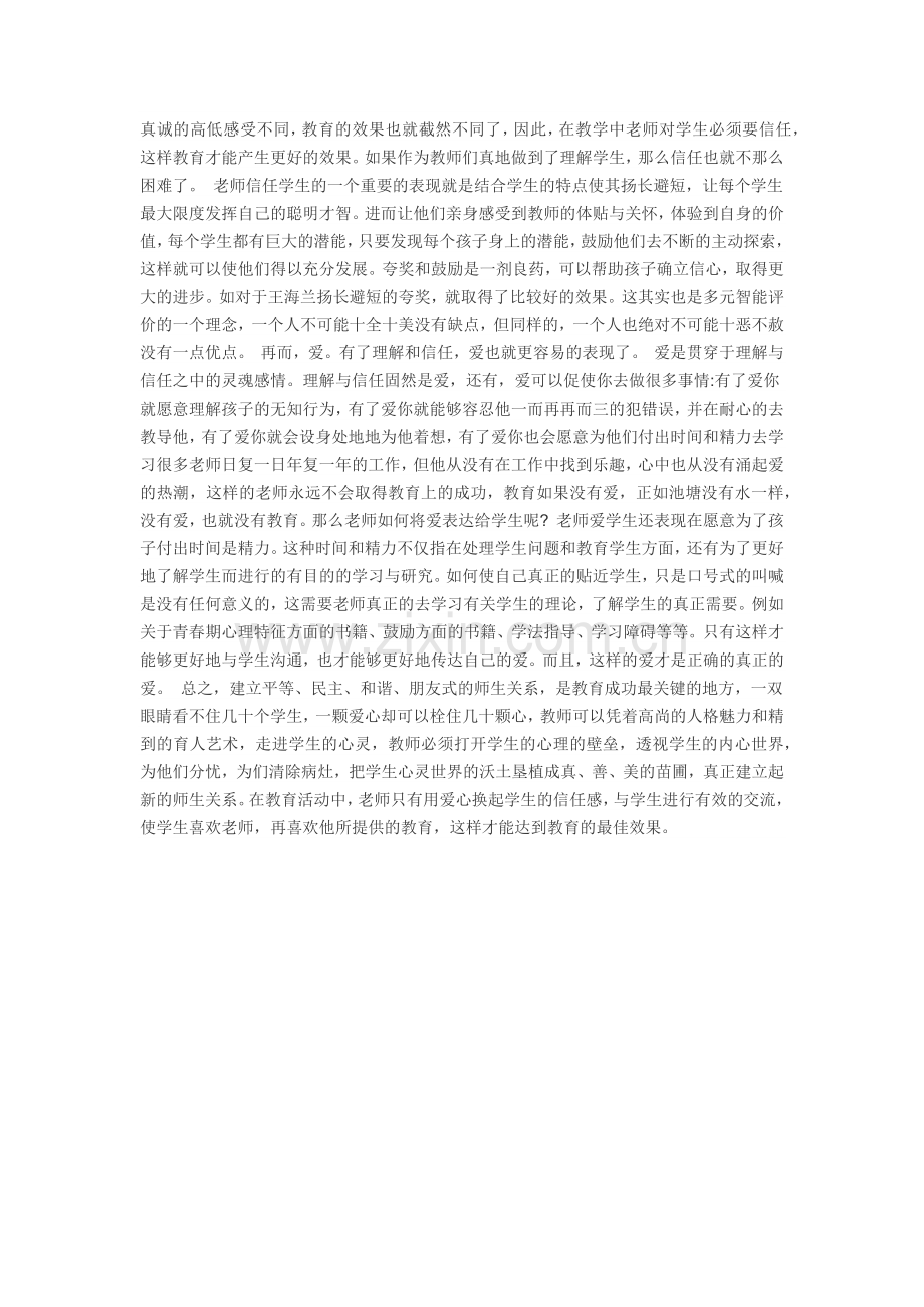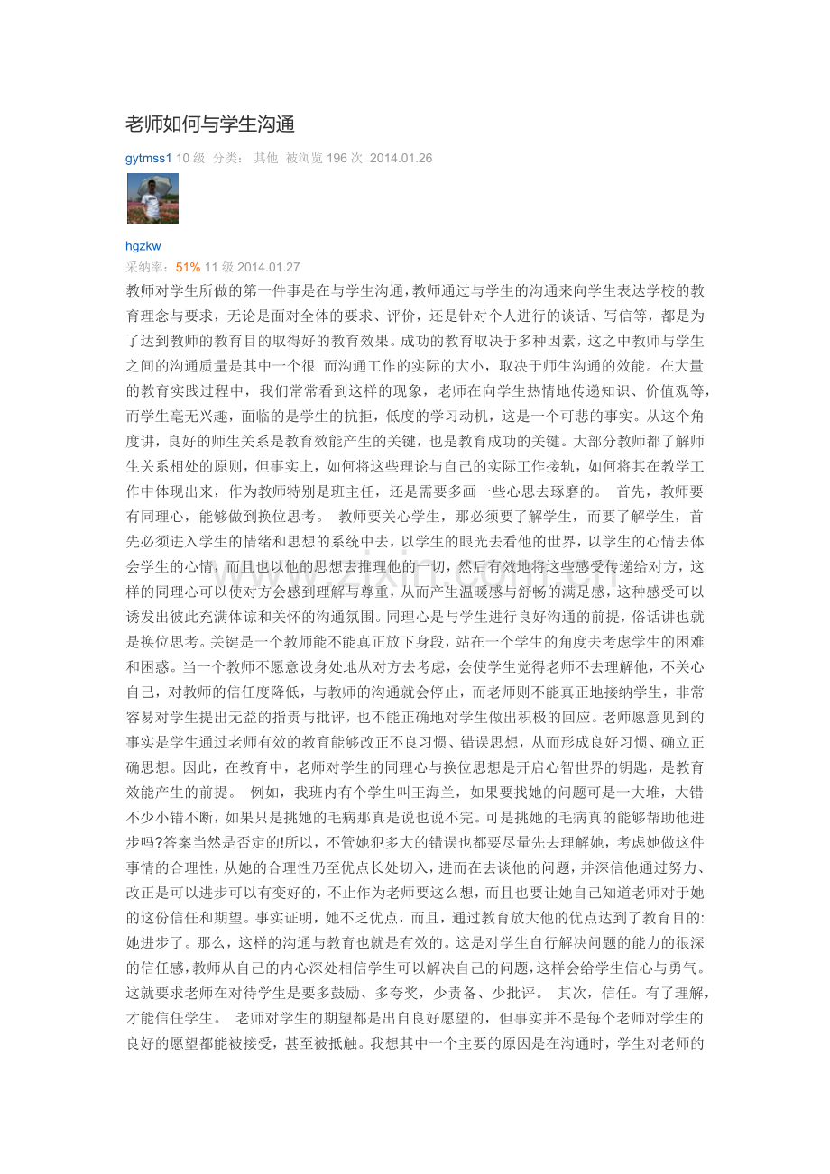 教师对学生所做的第一件事是在与学生沟通,教师通过与学生的沟通来向学生表达学校的教育理念与要求,无论是面对全体的要求、评价,还是针对个人进行的谈话、写信等,都是为了达到教师的教育目的取得好的教育效果。成功的教育取决于多种因素,这之中教师与学生之间的沟通质量是其中一个很 而沟通工作的实际的大小,取决于师生沟通的效能。在大量的教育实践过程中,我们常常看到这样的现象,老师在向学生热情地传递知识、价值观等,而学生毫无兴趣,面临的是学生的抗拒,低度的学习动机,这是一个可悲的事实。从这个角度讲,良好的师生关系是教育效能产生的关键,也是教育成功的关键。大部分教师都了解师生关系相处的原则,但事实上,如何将这些理论与自己的实际工作接轨,如何将其在教学工作中体现出来,作为教师特别是班主任,还是需要多画一些心思去琢磨的。 首先,教师要有同理心,能够做到换位思考。 教师要关心学生,那必须要了解学生,而要了解学生,首先必须进入学生的情绪和思想的系统中去,以学生的眼光去看他的世界,以学生的心情去体会学生的心情,而且也以他的思想去推理他的一切,然后有效地将这些感受传递给对方,这样的同理心可以使对方会感到理解与尊重,从而产生温暖感与舒畅的满足感,这种感受可以诱发出彼此充满体谅和关怀的沟通氛围。同理心是与学生进行良好沟通的前提,俗话讲也就是换位思考。关键是一个教师能不能真正放下身段,站在一个学生的角度去考虑学生的困难和困惑。当一个教师不愿意设身处地从对方去考虑,会使学生觉得老师不去理解他,不关心自己,对教师的信任度降低,与教师的沟通就会停止,而老师则不能真正地接纳学生,非常容易对学生提出无益的指责与批评,也不能正确地对学生做出积极的回应。老师愿意见到的事实是学生通过老师有效的教育能够改正不良习惯、错误思想,从而形成良好习惯、确立正确思想。因此,在教育中,老师对学生的同理心与换位思想是开启心智世界的钥匙,是教育效能产生的前提。 例如,我班内有个学生叫王海兰,如果要找她的问题可是一大堆,大错不少小错不断,如果只是挑她的毛病那真是说也说不完。可是挑她的毛病真的能够帮助他进步吗?答案当然是否定的!所以,不管她犯多大的错误也都要尽量先去理解她,考虑她做这件事情的合理性,从她的合理性乃至优点长处切入,进而在去谈他的问题,并深信他通过努力、改正是可以进步可以有变好的,不止作为老师要这么想,而且也要让她自己知道老师对于她的这份信任和期望。事实证明,她不乏优点,而且,通过教育放大他的优点达到了教育目的:她进步了。那么,这样的沟通与教育也就是有效的。这是对学生自行解决问题的能力的很深的信任感,教师从自己的内心深处相信学生可以解决自己的问题,这样会给学生信心与勇气。这就要求老师在对待学生是要多鼓励、多夸奖,少责备、少批评。 其次,信任。有了理解,才能信任学生。 老师对学生的期望都是出自良好愿望的,但事实并不是每个老师对学生的良好的愿望都能被接受,甚至被抵触。我想其中一个主要的原因是在沟通时,学生对老师的真诚的高低感受不同,教育的效果也就截然不同了,因此,在教学中老师对学生必须要信任,这样教育才能产生更好的效果。如果作为教师们真地做到了理解学生,那么信任也就不那么困难了。 老师信任学生的一个重要的表现就是结合学生的特点使其扬长避短,让每个学生最大限度发挥自己的聪明才智。进而让他们亲身感受到教师的体贴与关怀,体验到自身的价值,每个学生都有巨大的潜能,只要发现每个孩子身上的潜能,鼓励他们去不断的主动探索,这样就可以使他们得以充分发展。夸奖和鼓励是一剂良药,可以帮助孩子确立信心,取得更大的进步。如对于王海兰扬长避短的夸奖,就取得了比较好的效果。这其实也是多元智能评价的一个理念,一个人不可能十全十美没有缺点,但同样的,一个人也绝对不可能十恶不赦没有一点优点。 再而,爱。有了理解和信任,爱也就更容易的表现了。 爱是贯穿于理解与信任之中的灵魂感情。理解与信任固然是爱,还有,爱可以促使你去做很多事情:有了爱你就愿意理解孩子的无知行为,有了爱你就能够容忍他一而再再而三的犯错误,并在耐心的去教导他,有了爱你就会设身处地地为他着想,有了爱你也会愿意为他们付出时间和精力去学习很多老师日复一日年复一年的工作,但他从没有在工作中找到乐趣,心中也从没有涌起爱的热潮,这样的老师永远不会取得教育上的成功,教育如果没有爱,正如池塘没有水一样,没有爱,也就没有教育。那么老师如何将爱表达给学生呢? 老师爱学生还表现在愿意为了孩子付出时间是精力。这种时间和精力不仅指在处理学生问题和教育学生方面,还有为了更好地了解学生而进行的有目的的学习与研究。如何使自己真正的贴近学生,只是口号式的叫喊是没有任何意义的,这需要老师真正的去学习有关学生的理论,了解学生的真正需要。例如关于青春期心理特征方面的书籍、鼓励方面的书籍、学法指导、学习障碍等等。只有这样才能够更好地与学生沟通,也才能够更好地传达自己的爱。而且,这样的爱才是正确的真正的爱。 总之,建立平等、民主、和谐、朋友式的师生关系,是教育成功最关