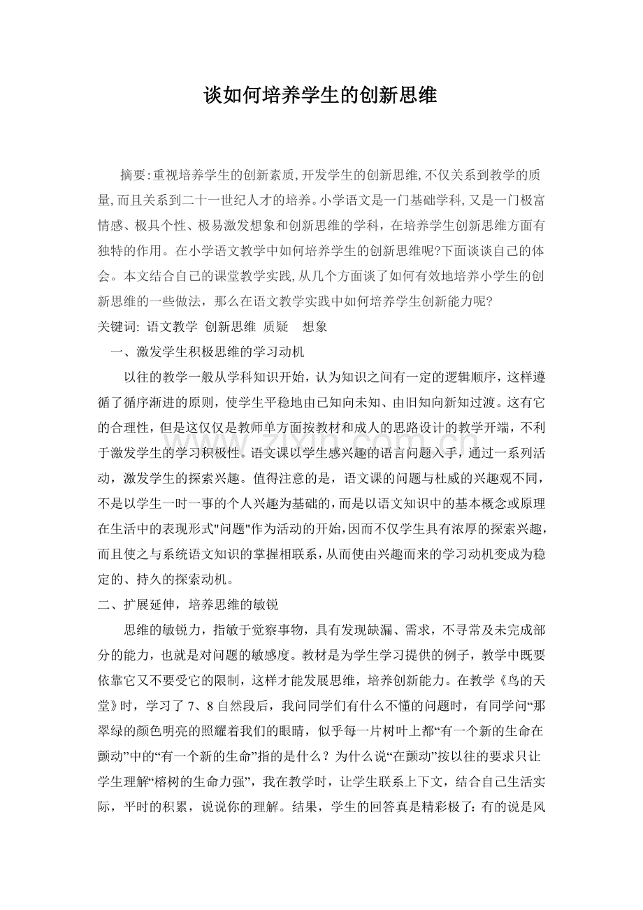 摘要:重视培养学生的创新素质,开发学生的创新思维,不仅关系到教学的质量,而且关系到二十一世纪人才的培养。小学语文是一门基础学科,又是一门极富情感、极具个性、极易激发想象和创新思维的学科,在培养学生创新思维方面有独特的作用。在小学语文教学中如何培养学生的创新思维呢?下面谈谈自己的体会。本文结合自己的课堂教学实践,从几个方面谈了如何有效地培养小学生的创新思维的一些做法,那么在语文教学实践中如何培养学生创新能力呢?