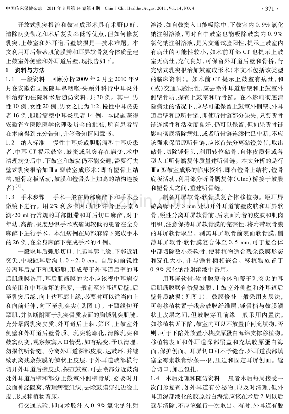论著作者简介:许为青,副主任医师,:耳后带蒂肌筋膜瓣和耳屏软骨 软骨膜复合体在伴有开放式乳突根治 型鼓室成形术中的应用许为青,孙敬武(安徽医科大学附属省立医院、安徽省立医院耳鼻咽喉头颈外科,合肥 )摘要 目的探讨耳后带蒂肌筋膜瓣和耳屏软骨 软骨膜复合体在伴有开放式乳突根治的 型鼓室成形术的应用价值。方法回顾性分析 年 月至 年 月在安徽省立医院耳鼻咽喉 头颈外科行中耳炎外科治疗的 例患者住院和术后随访资料。结果利用耳后带蒂肌筋膜瓣和耳屏软骨 软骨膜复合体修复鼓膜、上鼓室外侧壁和外耳道后壁缺损,其中,同时利用部分听骨赝复体质量建听骨链。例患耳耳屏和耳后切口皆一期甲级愈合,移植物皆成活,外耳道无狭窄,干耳时间 周,中位数为 周。收集了 例患者的术前和术后纯音听阈测定资料,术前 、和 纯音听阈均数()气骨导差值为 ,均数 标准差为(),术后 气骨导差值为 ,均数 标准差为(),其中,术后 气骨导差值 的有 例(),术后 气骨导差值缩小 以上的有 例,占观察病例的 。结论联合应用耳后带蒂肌筋膜瓣和耳屏软骨 软骨膜复合体行鼓膜修补及上鼓室外侧壁和外耳道后壁缺损,可以在彻底清除中耳病变的同时尽可能恢复外耳道和中耳形态,干耳率和移植物成活率高,大部分患者术后听力获得改善。关键词 中耳炎;外科皮瓣;鼓膜成形术;耳道;听小骨假体中图分类号:;文献标识码:,(,)?(,)(、)();(、)()()(),;中国临床保健杂志 年 月第 卷第 期 ,开放式乳突根治和鼓室成形术具有术野良好、清除病变彻底和术后复发率低等优点,但如何修复乳突、上鼓室和外耳道后壁缺损是一技术难题。本文利用耳后带蒂肌筋膜瓣和耳屏软骨复合体质量建上鼓室外侧壁和外耳道后壁,现报告如下。资料与方法 一般资料回顾分析 年月至 年月在安徽省立医院耳鼻咽喉 头颈外科行中耳炎外科治疗的住院和术后随访资料,共 例。其中,男性 例,女性 例,男女之比为 ,慢性中耳炎患者 例,胆脂瘤型中耳炎患者 例。本课题获得安徽省立医院医学伦理委员会的批准,所有患者皆在术前得到充分告知,并签署知情同意书。纳入标准 慢性中耳炎或胆脂瘤型中耳炎患者,中耳 提示鼓室、鼓窦或乳突存在病变,术中清理病变后中、下鼓室和鼓窦仍不能交通,需要行去壁式乳突根治加 型鼓室成形术(即有镫骨上结构,镫骨底板活动,鼓膜和镫骨头上加高的结构连接者)。手术步骤 手术一般在局部麻醉下和手术显微镜下进行。用 利多卡因(加少许肾上腺素 滴 行常规的耳部阻滞和耳后切口麻醉,对于年幼、高龄、极度恐惧手术或痛阈较低的患者在全身麻醉下进行手术。本组病例在局部麻醉下完成手术的 例,在全身麻醉下完成手术的 例。一般取耳后弧形切口,上起耳廓上缘,下邻近乳突尖,中段距耳后沟 。自后向前锐性分离耳后皮下和肌筋膜,形成蒂于外耳道后壁的耳后肌筋膜备用,耳后肌筋膜的大小应该视中耳病变的范围和中耳破坏的程度,一般前至外耳道后壁,后至乳突后缘,向上达耳廓上缘,必要时可以适当向上和向前延伸,向下至乳突尖(见图 )。于颞线切开颞肌,并切断附丽于乳突骨质表面的胸锁乳突肌腱,充分暴露乳突皮质、外耳道后上棘、筛区、上鼓室外侧壁和外耳道后壁骨质。乳突轮廓化,清除乳突和鼓窦病变,观察鼓窦入口情况,如有病变,予以清理,勿损伤听骨链。分离外耳道深部皮肤,达鼓环,并继续剥离残余鼓膜的鳞状上皮层,于外耳道峡部横行切开外耳道后壁皮肤,探查鼓室,可去除部分近鼓沟处外耳道后壁和部分上鼓室外侧壁骨质,必要时开放面神经隐窝,清理病变组织,去除鼓膜穿孔边缘上皮,形成移植物着床。行交通试验,即向术腔注入 氯化钠注射溶液,如自鼓窦入口能吸除中、下鼓室内 氯化钠注射溶液,同时自中鼓室也能吸除鼓窦内 氯化钠注射溶液,是为交通试验阳性,提示上鼓室内有病灶的可能性较小,如术前耳部 也提示上鼓室无病灶,充气良好,可保留外耳道后壁和骨桥,行完壁式乳突根治加鼓室成形术(本文不包括该类型的临床资料)。如术前 提示上鼓室有病灶,和(或)交通试验阴性,应去除外耳道后壁和上鼓室外侧壁骨质,探查上鼓室和听骨链。在不影响彻底清除病灶的情况下,应尽可能保留上鼓室外侧壁、外耳道后壁和原听骨链,即使听骨链部分缺失,只要听骨链连续性和活动度良好,仍可以保留,但如果听骨链影响彻底清除病灶,或者听骨链连续性已中断,不应该强求保留原听骨链,应该首先分离砧镫关节,取出砧骨,切除锤骨头,利用转位砧骨、自体皮质骨或各型人工听骨赝复体质量建听骨链。本文分析的是行 型鼓室成形的临床资料,即有镫骨上结构,镫骨底板活动,利用部分听骨赝复体()桥接于鼓膜和镫骨头之间,重建听骨链。制备耳屏软骨 软骨膜复合体移植物。距耳屏游离缘下方 处切开外耳道前壁皮肤和耳屏软骨,锐性分离耳屏软骨前、后表面附着的皮肤和肌肉组织,注意保持耳屏软骨膜的完整性,将附带软骨膜的耳屏软骨取出。剥离耳屏软骨前表面软骨膜,削薄耳屏软骨 软骨膜复合体至 ,可于复合体中部切除数小条软骨,使移植物适合残余鼓膜形态和穿孔大小,并与锤骨柄相嵌合。移植物放置于 氯化钠注射溶液中备用。用耳屏软骨 软骨膜复合体和蒂于乳突尖的耳后肌筋膜联合修复鼓膜、上鼓室外侧壁和外耳道后壁骨质缺损(见图 )。鼓膜修补一般采用夹
