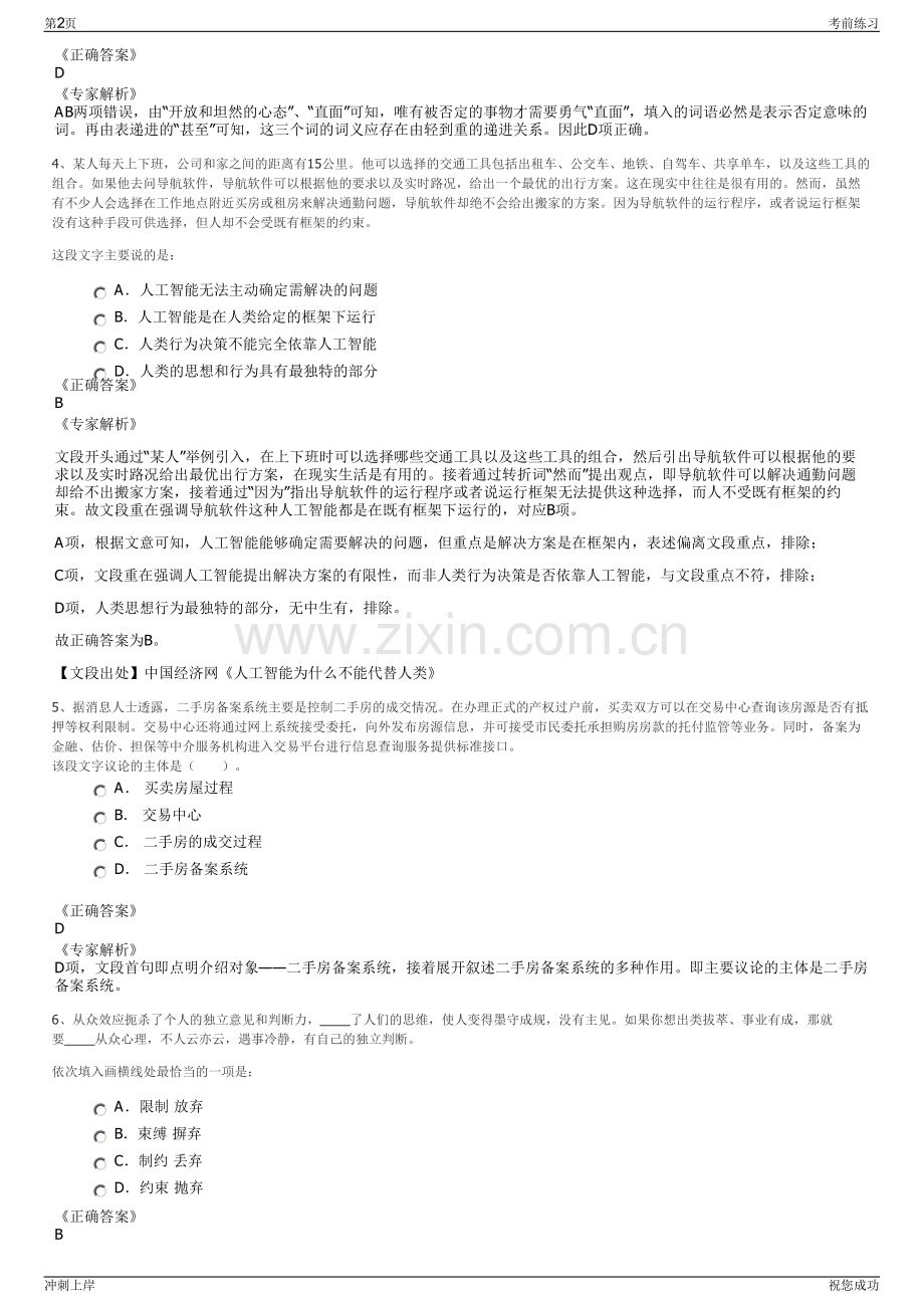 2024年福建泉州市搏浪科技集团有限公司招聘笔试冲刺题(带答案解析)【下载须知】:1,本套练习包含以下题型:言语理解与表达题、常识判断题、数量关系题、判断推理题和资料分析题等题型;共135道。2、本套试题根据常见招考题总结归纳,主要用于练习答题思路和拓展知识面。3、本套试题非考试真题,且与福建泉州市搏浪科技集团有限公司无关。一、第一部分言语理解与表达(本部分包括表达与理解两方面的内容。请根据题目要求,在四个选项中选出一个最恰当的答案。)1、人们吃进食物后,很快就被胃液消化掉了。胃液酸性很强,可从来没有把胃自己消化掉,其中奥秘何在?事实上,胃液在消化食物的同时,也对胃壁有一定的损害作用,即造成一些细胞的死亡。但是由于胃有很强的再生能力,因此这种损害仅仅是暂时的,胃能很快恢复如初。美国密歇根大学医学系德本教授的研究资料表明,每分钟胃的表面能够产生约50万个新细胞。也就是说只需三天,就可以再生出一个新胃来。然而,由于胃液能在几小时内把胃的组织溶化掉,只靠产生的新细胞,还来不及完全弥补所造成的损失。因此,还得另有本领才行。这段文字接下来主要讨论的是()。A 胃没有把自己消化掉的其他原因 B 胃液对胃壁有一定的损害作用 C 胃的生长速度 D 只靠胃液产生的新细胞,还不能及时完全地修补所造成的损失正确答案A专家解析由文段结尾“因此,还得另有本领才行”可知,接下来要讨论的是“另有本领”,即胃没有把自己消化掉的其他原因,因此A项正确。2、这位职业经理人具有过硬的专业素质,他通过对基于差异化战略的企业管理进行了研究,提出了有效的公司发展策略,为全面提高公司综合竞争力作出了贡献。以上句子的语病类型是:A成分残缺 B成分赘余 C搭配不当 D不合逻辑正确答案B专家解析“他通过对基于差异化战略的企业管理进行了研究”中“通过对基于”成分赘余,可改成“他对差异化战略的企业管理进行了研究”。故正确答案为B。3、影片大国崛起讲述了一个新的历史叙事,它关注不同的大国在不同历史时期“崛起”的原因。以开放和坦然的心态直面那些过去被_的历史。填入划横线部分最恰当的一项是()。A 赞扬、肯定、甚至奉为教条 B 扬弃、赞美、甚至视为真理 C 批判、避讳、甚至遗忘 D 忽视、避讳、甚至批判第1页考前练习冲刺上岸祝您成功正确答案D专家解析AB两项错误,由“开放和坦然的心态”、“直面”可知,唯有被否定的事物才需要勇气“直面”,填入的词语必然是表示否定意味的词。再由表递进的“甚至”可知,这三个词的词义应存在由轻到重的递进关系。因此D项正确。4、某人每天上下班,公司和家之间的距离有15公里。他可以选择的交通工具包括出租车、公交车、地铁、自驾车、共享单车,以及这些工具的组合。如果他去问导航软件,导航软件可以根据他的要求以及实时路况,给出一个最优的出行方案。这在现实中往往是很有用的。然而,虽然有不少人会选择在工作地点附近买房或租房来解决通勤问题,导航软件却绝不会给出搬家的方案。因为导航软件的运行程序,或者说运行框架没有这种手段可供选择,但人却不会受既有框架的约束。这段文字主要说的是:A人工智能无法主动确定需解决的问题 B人工智能是在人类给定的框架下运行 C人类行为决策不能完全依靠人工智能 D人类的思想和行为具有最独特的部分正确答案B专家解析文段开头通过“某人”举例引入,在上下班时可以选择哪些交通工具以及这些工具的组合,然后引出导航软件可以根据他的要求以及实时路况给出最优出行方案,在现实生活是有用的。接着通过转折词“然而”提出观点,即导航软件可以解决通勤问题却给不出搬家方案,接着通过“因为”指出导航软件的运行程序或者说运行框架无法提供这种选择,而人不受既有框架的约束。故文段重在强调导航软件这种人工智能都是在既有框架下运行的,对应B项。A项,根据文意可知,人工智能能够确定需要解决的问题,但重点是解决方案是在框架内,表述偏离文段重点,排除;C项,文段重在强调人工智能提出解决方案的有限性,而非人类行为决策是否依靠人工智能,与文段重点不符,排除;D项,人类思想行为最独特的部分,无中生有,排除。故正确答案为B。【文段出处】中国经济网人工智能为什么不能代替人类5、据消息人士透露,二手房备案系统主要是控制二手房的成交情况。在办理正式的产权过户前,买卖双方可以在交易中心查询该房源是否有抵押等权利限制。交易中心还将通过网上系统接受委托,向外发布房源信息,并可接受市民委托承担购房房款的托付监管等业务。同时,备案为金融、估价、担保等中介服务机构进入交易平台进行信息查询服务提供标准接口。该段文字议论的主体是()。A 买卖房屋过程 B 交易中心 C 二手房的成交过程 D 二手房备案系统正确答案D专家解析D项,文段首句即点明介绍对象二手房备案系统,接着展开叙述二手房备案系统的多种作用。即主要议论的主体是二手房备案系统。6、从众效应扼杀了个人的独立意见和判断力,了人们的思维,使人变得墨守成规,没有主见。如果你想出类拔萃、事业有成,那就要 从众心理,不人云亦云,遇事冷静,有自己的独立判断。依次填入画横线处最恰当的一项是:A限制 放弃 B束缚 摒弃 C制约 丢弃 D