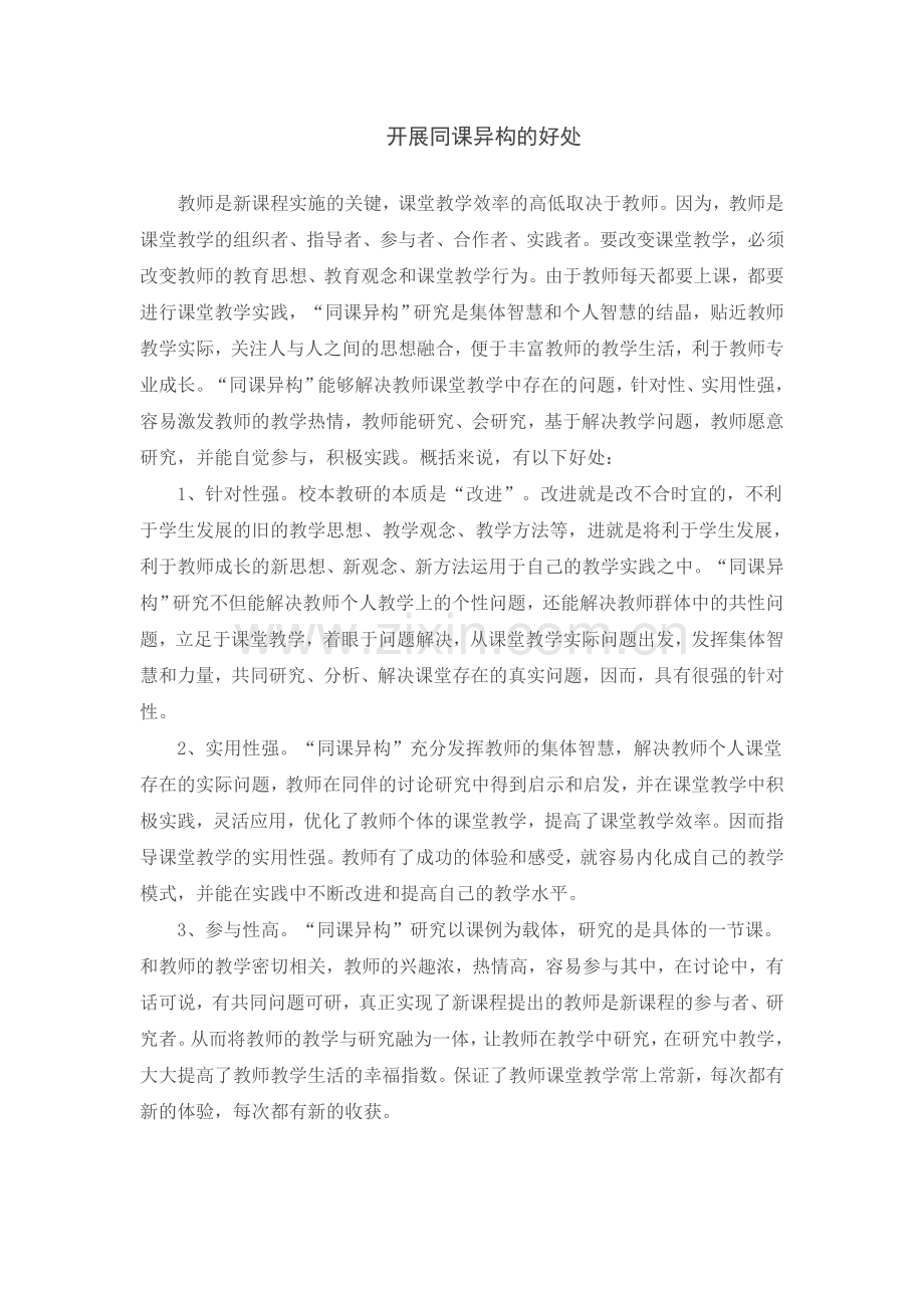 3、参与性高。“同课异构”研究以课例为载体,研究的是具体的一节课。和教师的教学密切相关,教师的兴趣浓,热情高,容易参与其中,在讨论中,有话可说,有共同问题可研,真正实现了新课程提出的教师是新课程的参与者、研究者。从而将教师的教学与研究融为一体,让教师在教学中研究,在研究中教学,大大提高了教师教学生活的幸福指数。保证了教师课堂教学常上常新,每次都有新的体验,每次都有新的收获。