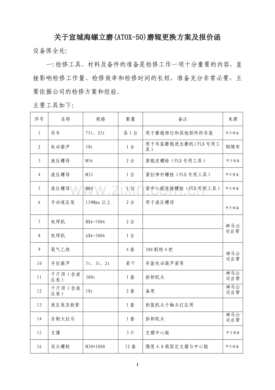 关于宣城海螺立磨(ATOX-50)磨辊更换方案及报价函