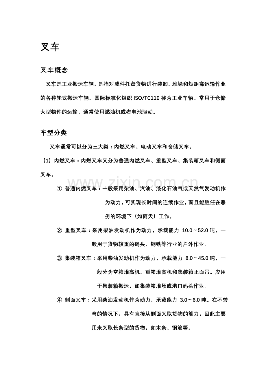 (1)内燃叉车:内燃叉车又分为普通内燃叉车、重型叉车、集装箱叉车和侧面叉车。