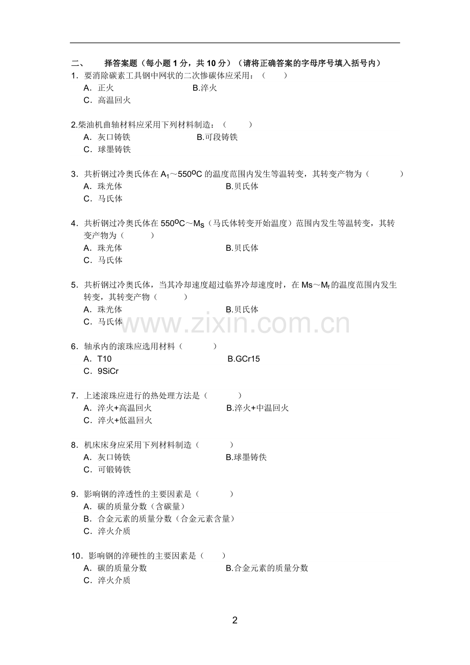 二、 择答案题(每小题1分,共10分)(请将正确答案的字母序号填入括号内)