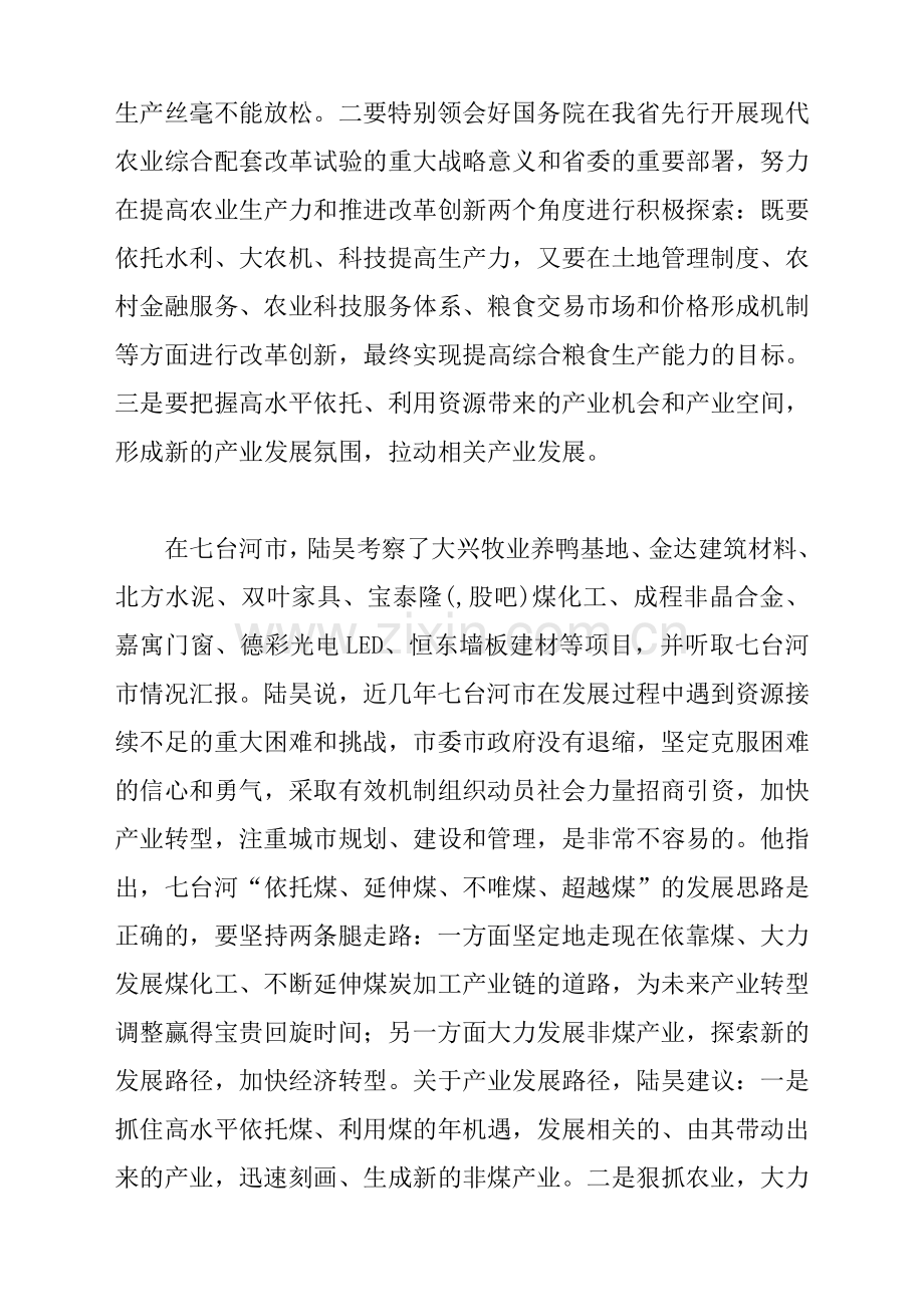陆昊先后考察了鸡西市宝鑫碳化硅陶瓷材料项目、贝特瑞公司石墨深加工项目、天和焦化项目、天诚镁合金综合利用项目、珍宝岛制药中药成品药建设项目、鸡西煤矿机械公司和鸡东县永安镇玉米播种现场,并与鸡西市负责同志座谈。陆昊对市委市政府坚决贯彻中央和省委省政府重大战略部署,落实发展阶段新要求,在快速发展中注重协调发展、绿色发展给予充分肯定。陆昊说,鸡西市狠抓产业项目,注重依托、利用资源延伸产业链,发展循环经济,发展高水平起点项目,显示了很好的发展势头和发展后劲。同时,本着对人民、对历史负责的态度,高度重视生态保护。结合调研情况,陆昊强调,一要始终高度重视农业,粮食生产丝毫不能放松。二要特别领会好国务院在我省先行开展现代农业综合配套改革试验的重大战略意义和省委的重要部署,努力在提高农业生产力和推进改革创新两个角度进行积极探索:既要依托水利、大农机、科技提高生产力,又要在土地管理制度、农村金融服务、农业科技服务体系、粮食交易市场和价格形成机制等方面进行改革创新,最终实现提高综合粮食生产能力的目标。三是要把握高水平依托、利用资源带来的产业机会和产业空间,形成新的产业发展氛围,拉动相关产业发展。