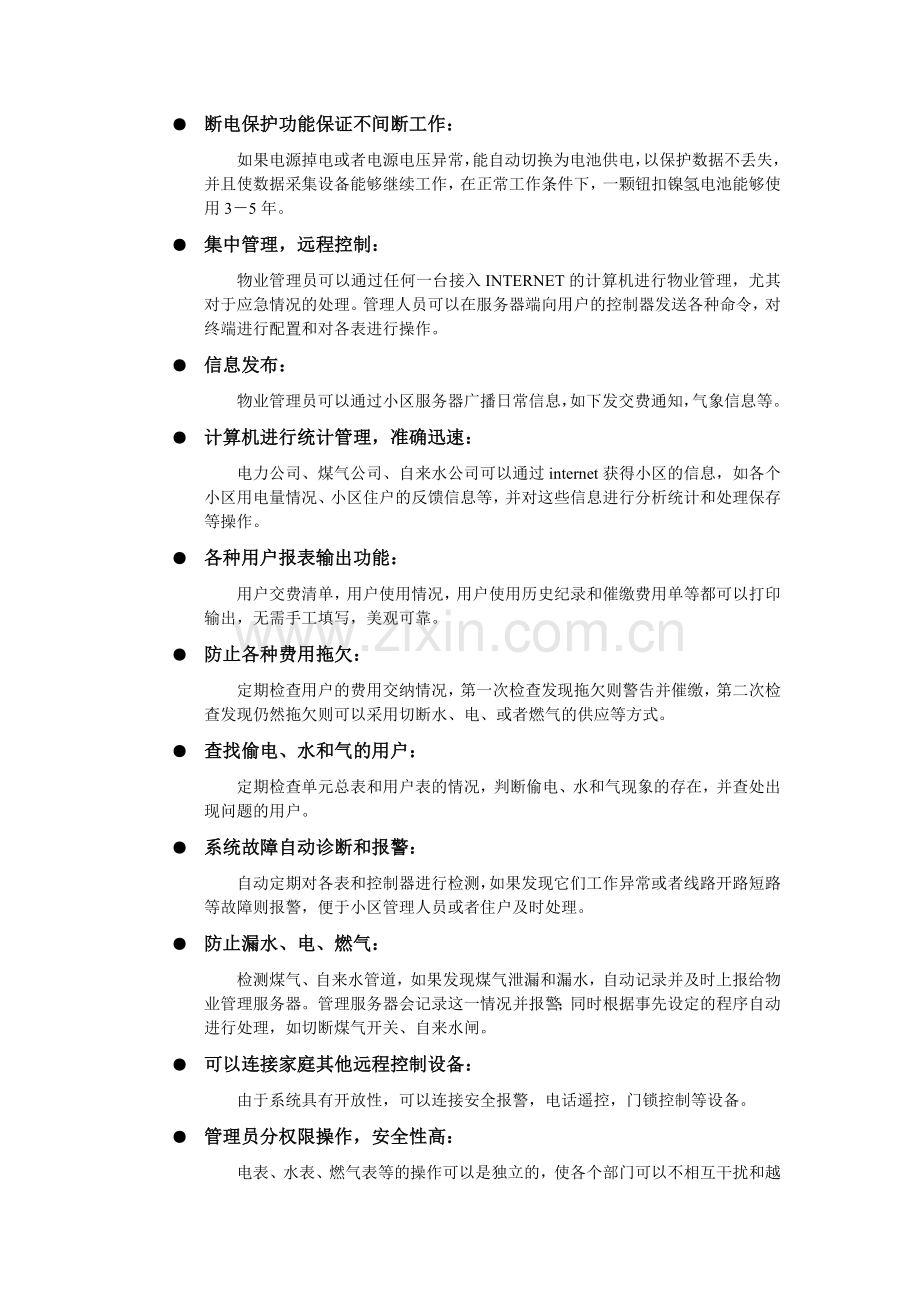 小区自动抄表系统除了实现远程抄表的功能外,还具有在发生煤气泄漏、漏水以及偷漏电等紧急情况下,及时报警并切断开关等功能,对住户拖欠电费、水费、燃气费等情况可进行远程控制。