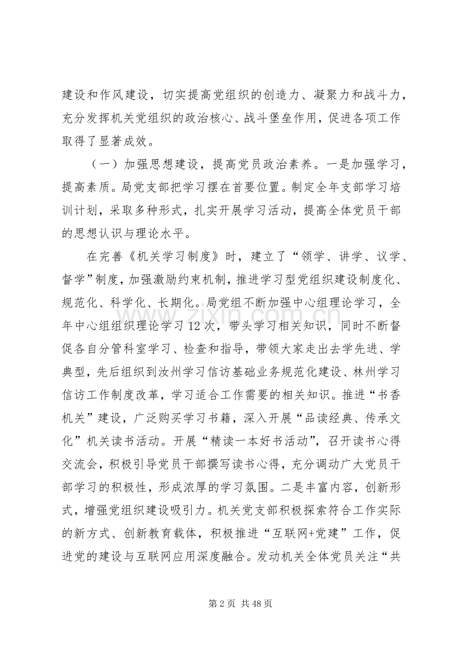 (三)加强作风建设,保证支部风清气正。一是认真开展民主双评工作。按照要求,及时召开全体党员会议,本着评出干劲评出良好氛围的原则,开展民主评议党员、党组织活动,自觉接受群众的监督,提高了全体党员的民主政治意识。同时,严格执行党务政务公开制度,用制度规范行为,确保党员既干事又干净。二是认真组织学习上级关于党员干部廉洁从政的相关文件精神,不折不扣地贯彻执行中央八项规定和省委、市委十项规定,按照《中国共产党纪律处分条例》、《中国共产党问责条例》、《中国共产党党内监督条例》和中办、国办印发的《领导干部报告个人有关事项规定》和《领导干部个人有关事项报告查核结果处理办法》的要求,把党风廉政教育落到实处,加强对党员干部的监督。严格执行监督执纪,做到抓早抓小、防微杜渐,提高了党员干部廉洁自律意识;三是进一步落实全面从严治党要求,不断健全完善全局工作人员学法用法制度,努力提高法制素养,不断增强干部的法制意识和依法办事能力。在全局开展以抓学习、抓管理、抓纪律、转作风的“三抓一转”专项活动,大力整治个别党员中存在的作风方面的问题,切实转变机关作风,着力提升工作效能,为信访工作改革提供政治、思想、组织保证。四是加强机关效能建设。综合运用攻坚突破、考评问责、曝光反面典型等方式,着力解决党员担当意识不足、压力传导递减、工作落实不力等问题。局机关各科室进一步健全完善岗位负责制、首问负责制、服务承诺制、限时办结制和失职追究制,提高服务水平和质量。