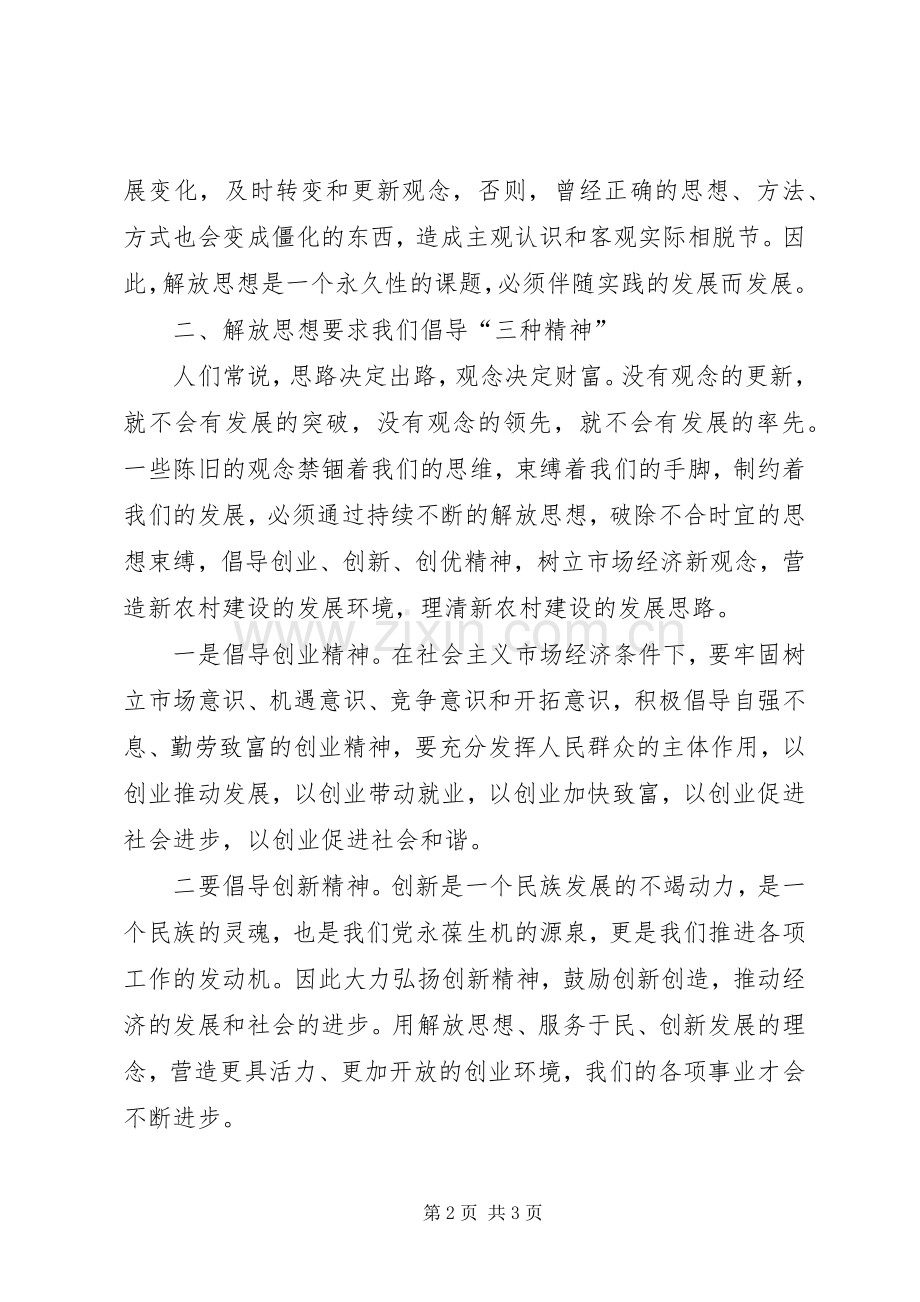 要发展,首先要解放思想,创新思维。思想的大解放,促进经济的大发展,而经济的大发展,也必将推动思想的大解放,这是一个矛盾的统一体,是一个辩证的统一过程。而实践永无止境,所以,发展永无止境,解放思想也就永无止境。邓小平同志指出:“解放思想,是指在马克思主义指导下打破习惯势力和主观偏见的束缚,研究新情况,解决新问题。”“解放思想,就是使思想和实际相符合,使主观和客观相符合,就是实事求是、创造性地工作。”从解放思想本身看,是一个长远的、循序渐进的过程,不可能一蹴而就,不可能一劳永逸。客观事物不断变化,我们的思想、认识也随之不断变化。实践是解放思想的基础,发展是解放思想的目的。相对于实践发展,我们的思想观念往往具有相对稳定性。因此,这就要求我们必须与时俱进,不断适应实践的发展变化,及时转变和更新观念,否则,曾经正确的思想、方法、方式也会变成僵化的东西,造成主观认识和客观实际相脱节。因此,解放思想是一个永久性的课题,必须伴随实践的发展而发展。