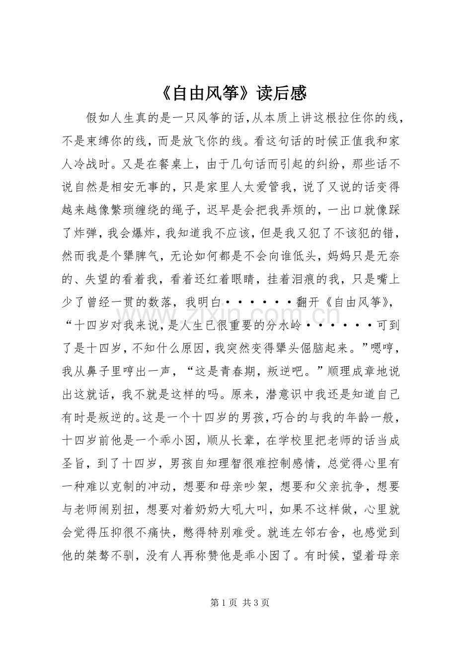 假如人生真的是一只风筝的话,从本质上讲这根拉住你的线,不是束缚你的线,而是放飞你的线。看这句话的时候正值我和家人冷战时。又是在餐桌上,由于几句话而引起的纠纷,那些话不说自然是相安无事的,只是家里人太爱管我,说了又说的话变得越来越像繁琐缠绕的绳子,迟早是会把我弄烦的,一出口就像踩了炸弹,我会爆炸,我知道我不应该,但是我又犯了不该犯的错,然而我是个犟脾气,无论如何都是不会向谁低头,妈妈只是无奈的、失望的看着我,看着还红着眼睛,挂着泪痕的我,只是嘴上少了曾经一贯的数落,我明白······翻开《自由风筝》,“十四岁对我来说,是人生已很重要的分水岭······可到了是十四岁,不知什么原因,我突然变得犟头倔脑起来。”嗯哼,我从鼻子里哼出一声,“这是青春期,叛逆吧。”顺理成章地说出这就话,我不就是这样的吗。原来,潜意识中我还是知道自己有时是叛逆的。这是一个十四岁的男孩,巧合的与我的年龄一般,十四岁前他是一个乖小囡,顺从长辈,在学校里把老师的话当成圣旨,到了十四岁,男孩自知理智很难控制感情,总觉得心里有一种难以克制的冲动,想要和母亲吵架,想要和父亲抗争,想要与老师闹别扭,想要对着奶奶大吼大叫,如果不这样做,心里就会觉得压抑很不痛快,憋得特别难受。就连左邻右舍,也感觉到他的桀骜不驯,没有人再称赞他是乖小囡了。有时候,望着母亲紧锁的眉头,望着父亲无奈的怒容,尤其是望着奶奶伤心的泪水,他的心里也会隐隐作痛。他的这些反思触动了我的心,仿佛心被揪起又重重地落下,我呢。我又何尝不是呐。很多时候,我们就这么僵持着,维持着一种仿佛真空的状态,我在真空瓶中,无法呼吸,想被解救,家人们在外面呼声叹气,而我却想听听不到,只看到失望的情绪流在瓶外,只看到,而没有勇气去擦干它们,缺乏的只是时间,能够让瓶中充满空气能够让我跳出来深吸一口气然后说“对不起”。有一天他和他的两个铁杆朋友,长脚和瓶盖,互说最痛恨的事情,三个人最终的中心思想出奇的一致,恨的都一样,爱的也都一样,恨受管束,爱自由。然而长脚和瓶盖都有令他羡慕的自由经历,在他眼里看来,自由的生活是在十四年中遥不可及的,于是这样他就越发地厌恶自己备受管束的生活,觉得像是坐了十四年的监狱一般。明德叔是他的邻居,是一个擅长做风筝、为人和蔼可亲的没有不良嗜好的单身汉,精力与时间全倾注在风筝上。他总是叫男孩帮忙抬大风筝,而男孩为这事却是十分乐意的,于是总像是跟屁虫一样跟在明德叔身后,看着风筝放飞。明德叔做了一只叫做“龙图腾”的巨无霸风筝,就在明德叔放起风筝,众人投向敬佩的目光切啧啧称奇时,瓶盖“悟”出了一番道理,他说,风筝飞得再高再远,一点也不自由,一点也不潇洒,总有一根绳子牵着它,他的一举一动都受到放风筝人的监视,命运在别人手中紧攒着,它发出哟哟的叫声,是在哭泣,在哀号,在悲鸣。男孩觉得自己跟风筝没什么两样,活得窝囊,活得憋气,活得不开心。谁也没想到,瓶盖引以为傲的一百本小说,被父亲付之一炬,当天夜里,三人相约出来,相互安慰,瓶盖的懊恼怨恨让三个人的心越靠越近,他们商量着要流浪,离家,决定在十天的准备之后实行流浪计划。