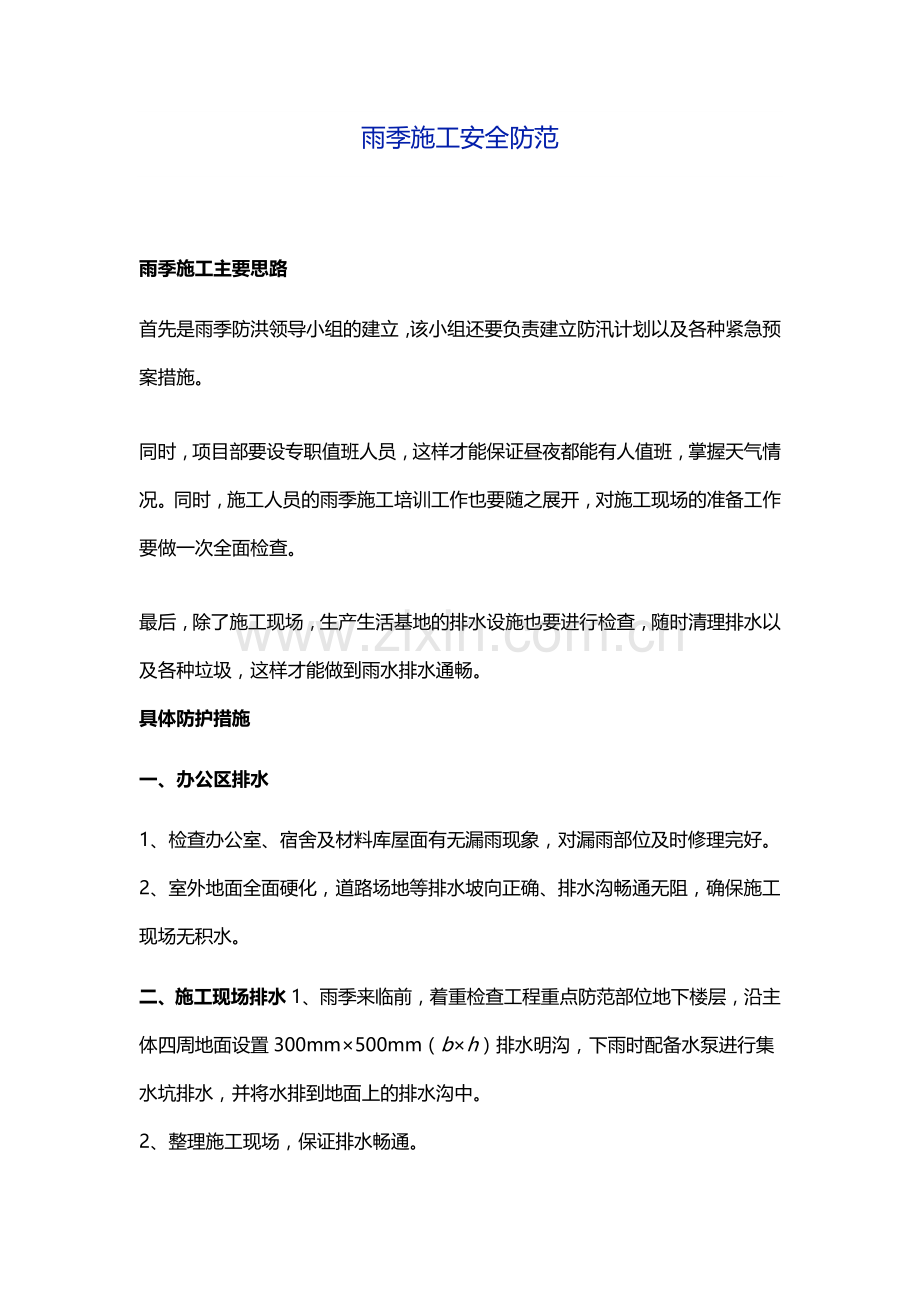 二、施工现场排水1、雨季来临前,着重检查工程重点防范部位地下楼层,沿主体四周地面设置300mm×500mm(b×h)排水明沟,下雨时配备水泵进行集水坑排水,并将水排到地面上的排水沟中。
