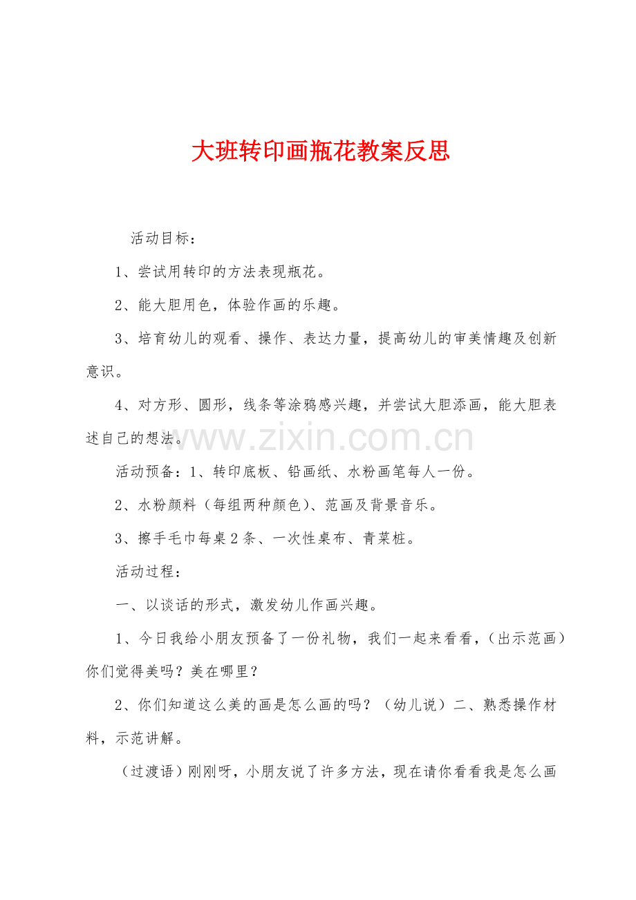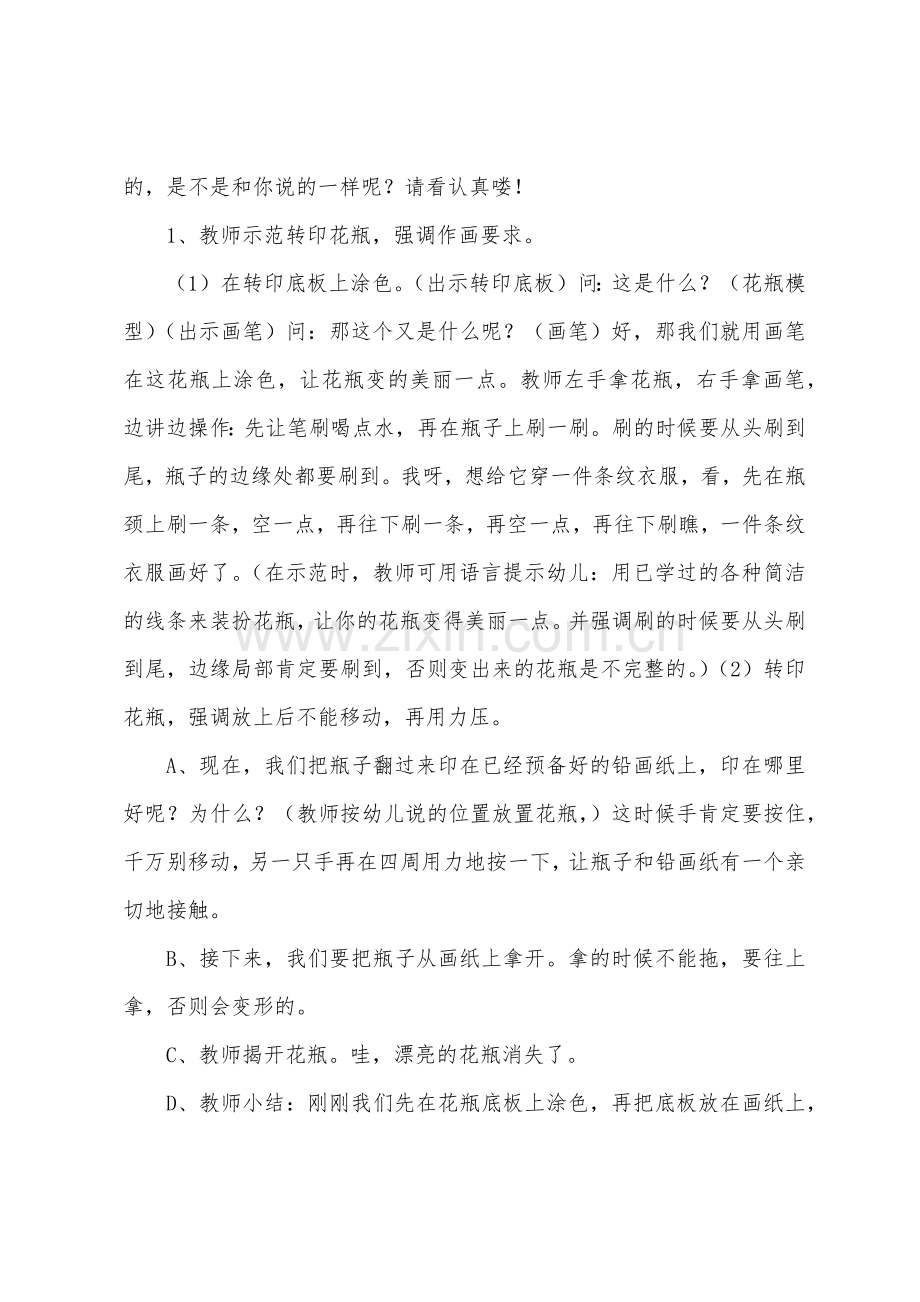 D、教师小结:刚刚我们先在花瓶底板上涂色,再把底板放在画纸上,这样一个美丽的花瓶就印出来了,我们把这种画画方法叫做转印。(让幼儿学说一遍)(3)熟悉印花材料,争论青菜桩印花方法。