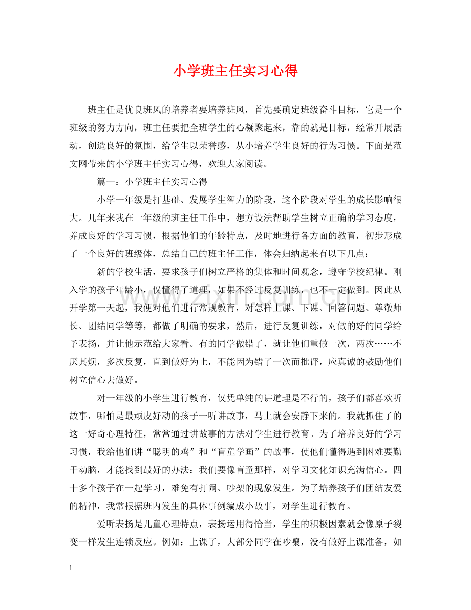 班主任是优良班风的培养者要培养班风,首先要确定班级奋斗目标,它是一个班级的努力方向,班主任要把全班学生的心凝聚起来,靠的就是目标,经常开展活动,创造良好的氛围,给学生以荣誉感,从小培养学生良好的行为习惯。下面是范文网带来的小学班主任实习心得,欢迎大家阅读。