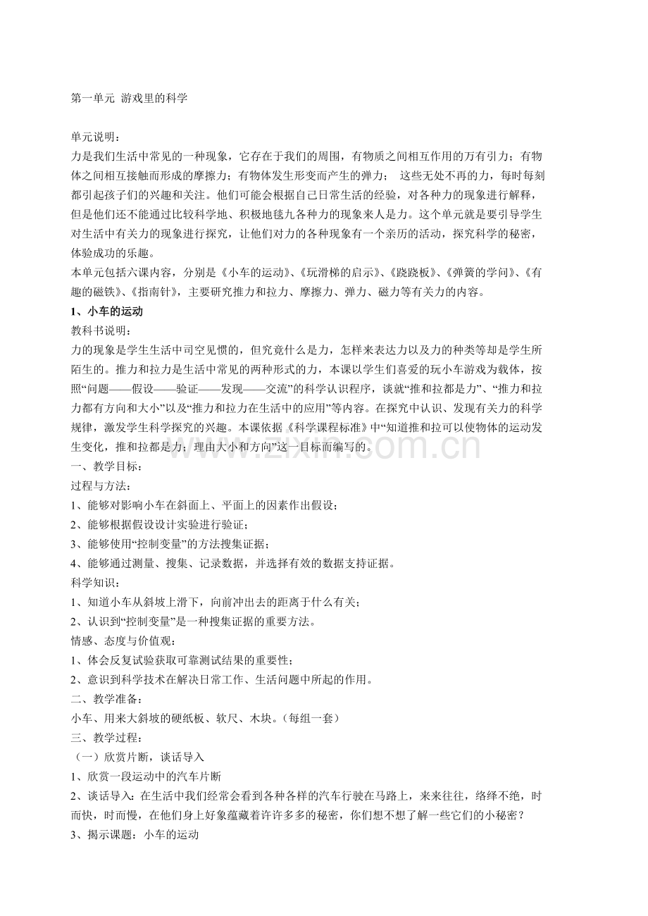 本单元包括六课内容,分别是《小车的运动》、《玩滑梯的启示》、《跷跷板》、《弹簧的学问》、《有趣的磁铁》、《指南针》,主要研究推力和拉力、摩擦力、弹力、磁力等有关力的内容。