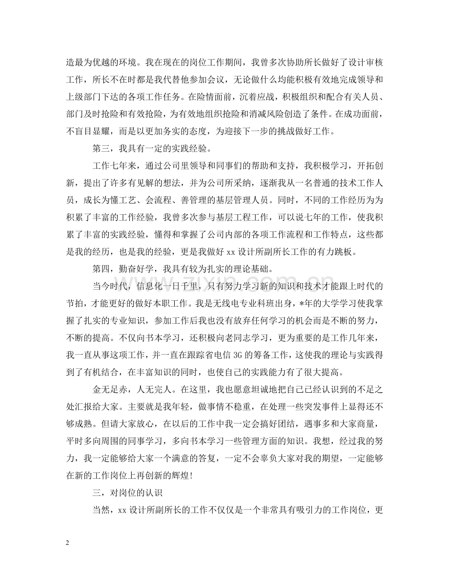 工作七年来,通过公司里领导和同事们的帮助和支持,我积极学习,开拓创新,提出了许多有见解的想法,并为公司所采纳,逐渐我从一名普通的技术工作人员,成长为懂工艺、会流程、善管理的基层管理人员。同时,不同的工作经历为为积累了丰富的工作经验,我曾多次参与基层工程工作,可以说七年的工作,使我积累了丰富的实践经验,懂得和掌握了公司内部的各项工作流程和工作特点,这些都是我的经历,也是我的经验,更是我做好xx设计所副所长工作的有力跳板。