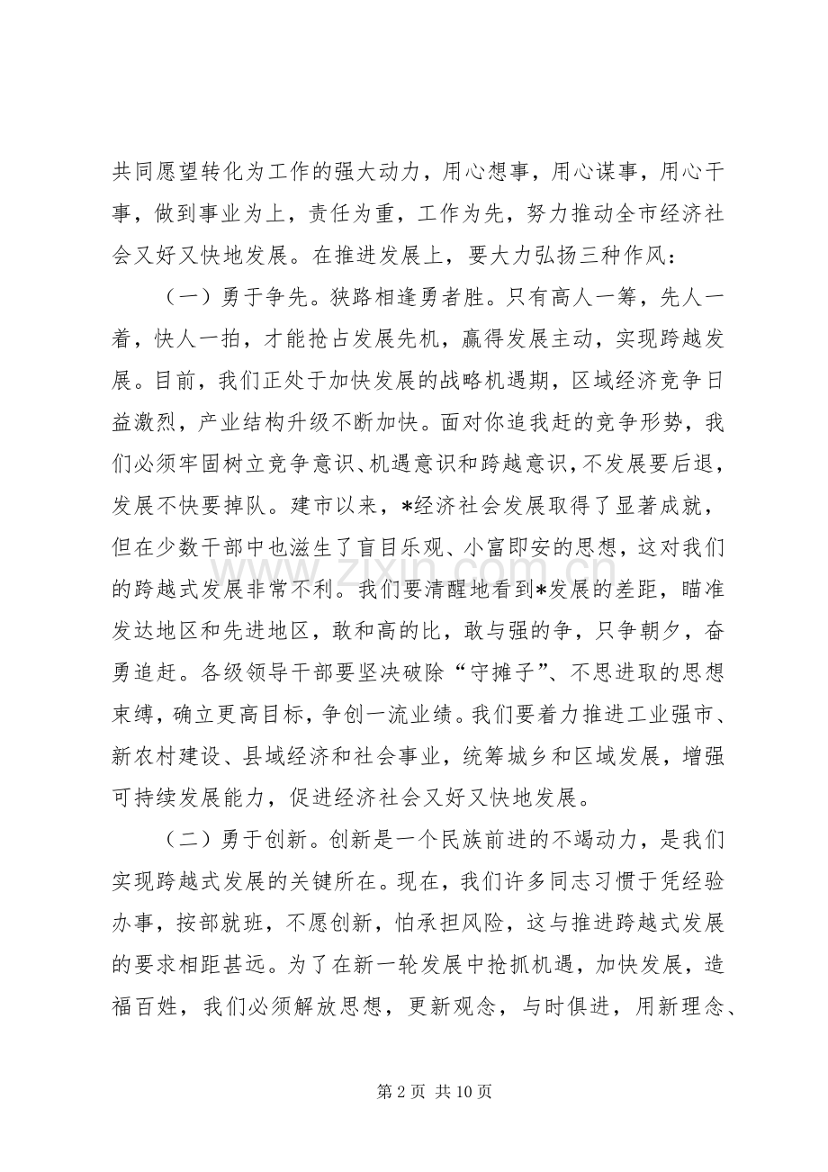 (一)勇于争先。狭路相逢勇者胜。只有高人一筹,先人一着,快人一拍,才能抢占发展先机,赢得发展主动,实现跨越发展。目前,我们正处于加快发展的战略机遇期,区域经济竞争日益激烈,产业结构升级不断加快。面对你追我赶的竞争形势,我们必须牢固树立竞争意识、机遇意识和跨越意识,不发展要后退,发展不快要掉队。建市以来,*经济社会发展取得了显著成就,但在少数干部中也滋生了盲目乐观、小富即安的思想,这对我们的跨越式发展非常不利。我们要清醒地看到*发展的差距,瞄准发达地区和先进地区,敢和高的比,敢与强的争,只争朝夕,奋勇追赶。各级领导干部要坚决破除“守摊子”、不思进取的思想束缚,确立更高目标,争创一流业绩。我们要着力推进工业强市、新农村建设、县域经济和社会事业,统筹城乡和区域发展,增强可持续发展能力,促进经济社会又好又快地发展。