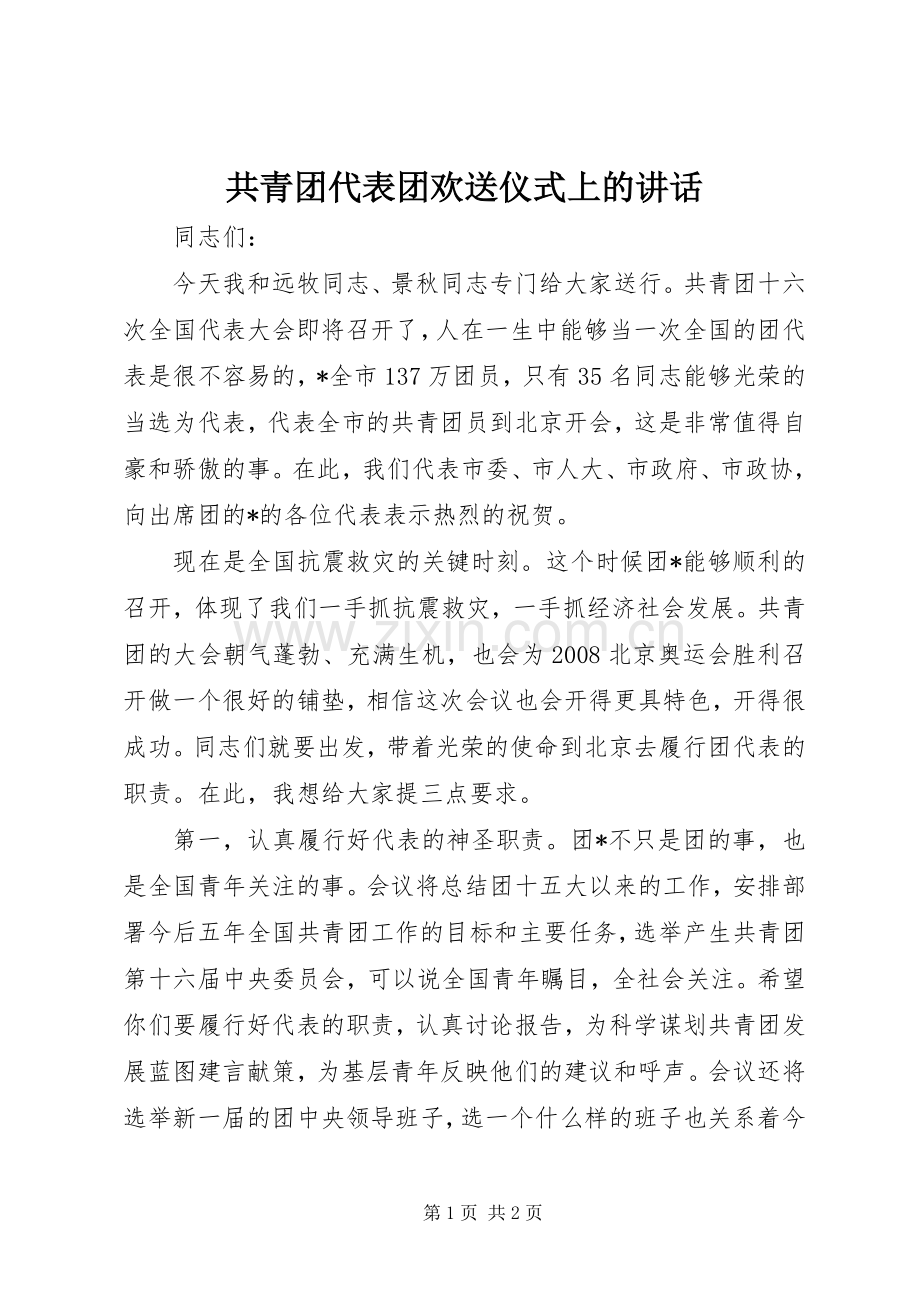 今天我和远牧同志、景秋同志专门给大家送行。共青团十六次全国代表大会即将召开了,人在一生中能够当一次全国的团代表是很不容易的,*全市137万团员,只有35名同志能够光荣的当选为代表,代表全市的共青团员到北京开会,这是非常值得自豪和骄傲的事。在此,我们代表市委、市人大、市政府、市政协,向出席团的*的各位代表表示热烈的祝贺。