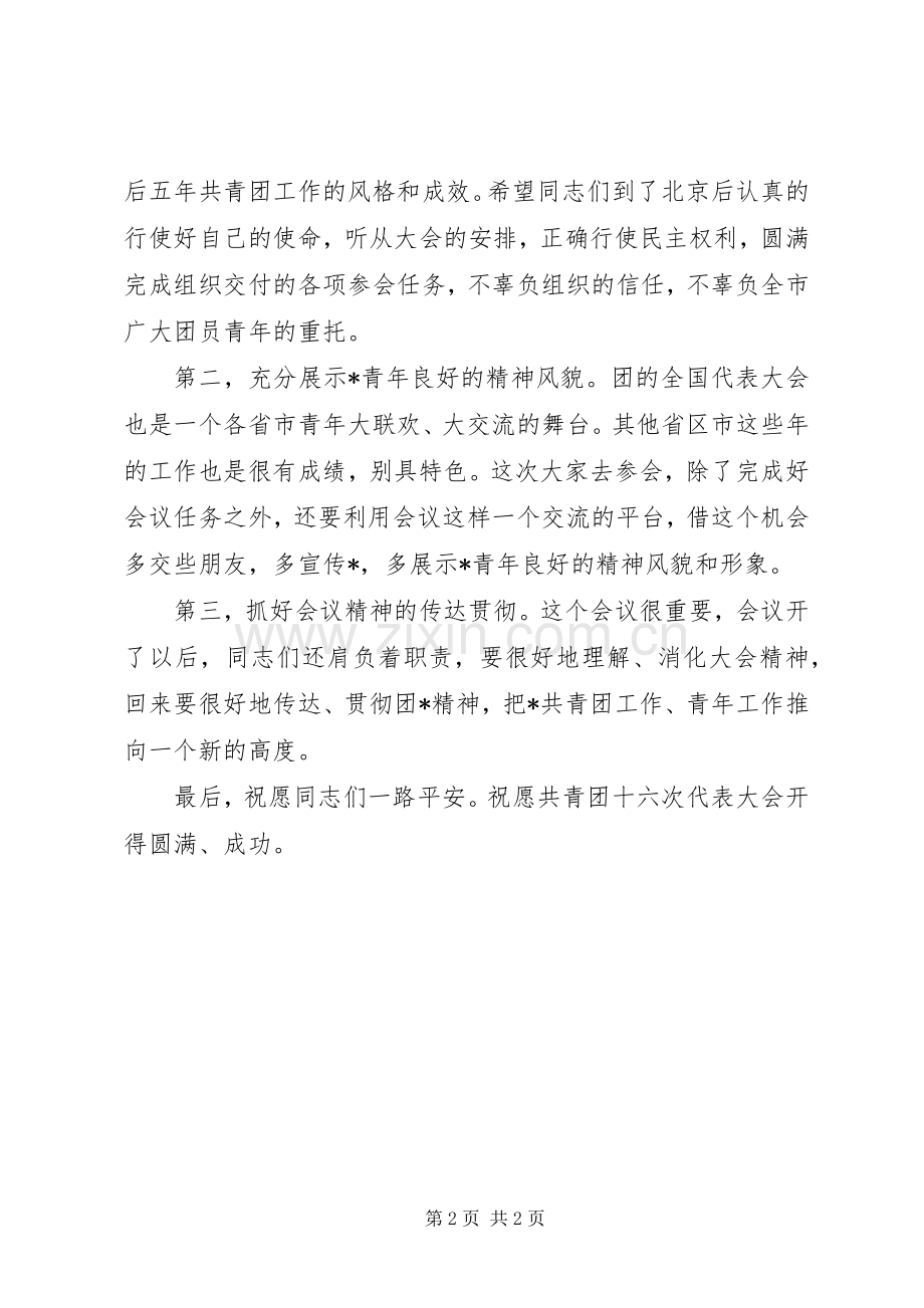 第一,认真履行好代表的神圣职责。团*不只是团的事,也是全国青年关注的事。会议将总结团十五大以来的工作,安排部署今后五年全国共青团工作的目标和主要任务,选举产生共青团第十六届中央委员会,可以说全国青年瞩目,全社会关注。希望你们要履行好代表的职责,认真讨论报告,为科学谋划共青团发展蓝图建言献策,为基层青年反映他们的建议和呼声。会议还将选举新一届的团中央领导班子,选一个什么样的班子也关系着今后五年共青团工作的风格和成效。希望同志们到了北京后认真的行使好自己的使命,听从大会的安排,正确行使民主权利,圆满完成组织交付的各项参会任务,不辜负组织的信任,不辜负全市广大团员青年的重托。