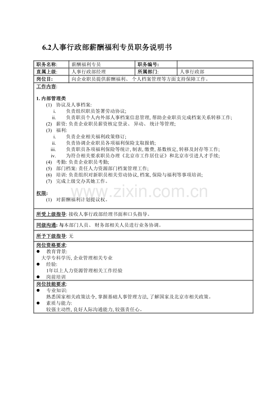 6.2.1人事行政部薪酬福利专员岗位目标和考评指标说明书
