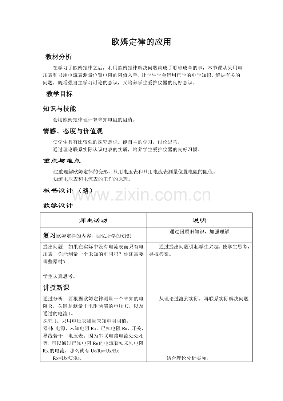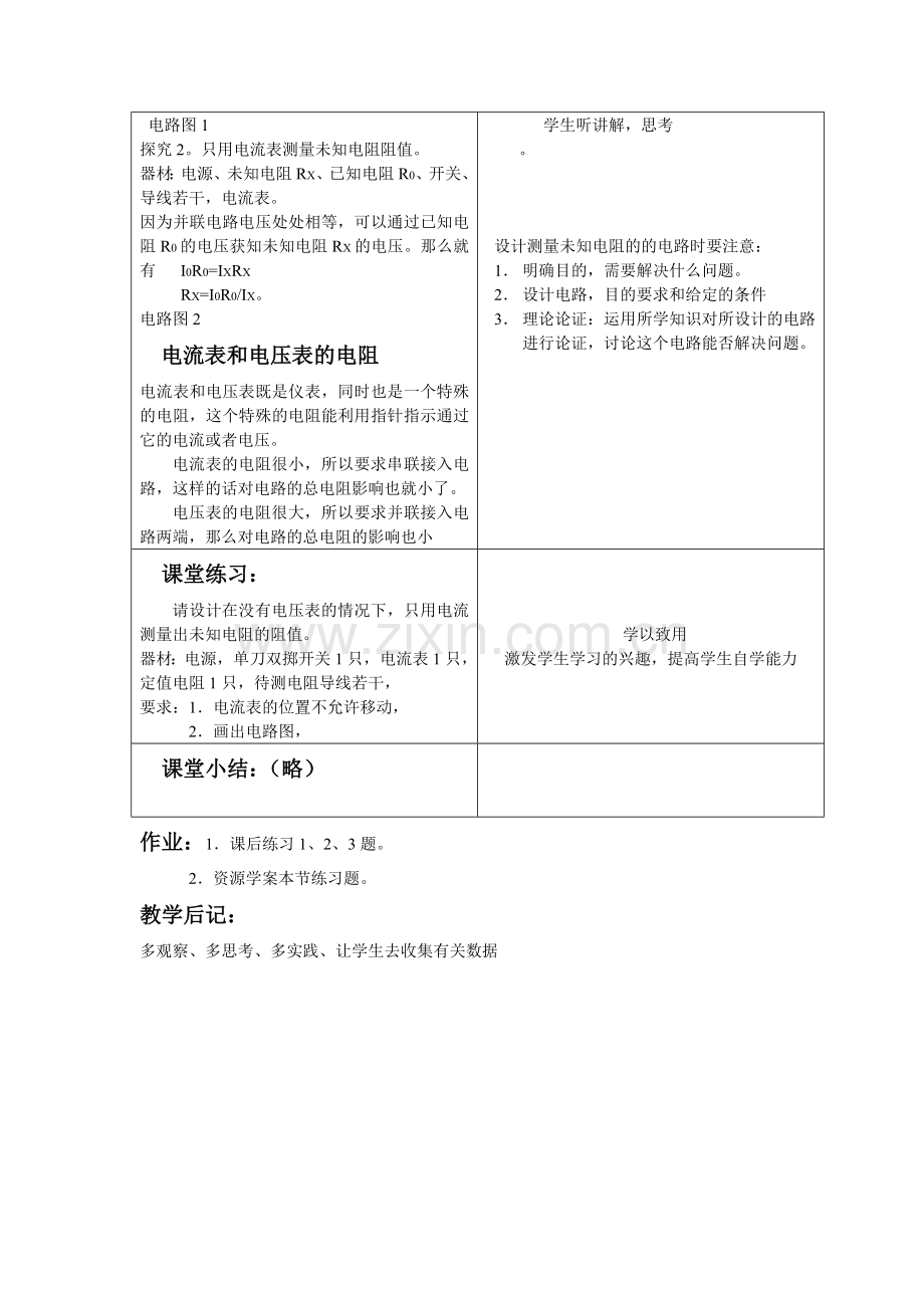 在学习了欧姆定律之后,利用欧姆定律解决问题就成了顺理成章的事,本节课从只用电压表和只用电流表测量位置电阻的阻值入手,让学生学会运用已学的电学知识,解决有关的问题,既增强自主学习讨论的意识,又培养学生爱护仪器的良好意识。