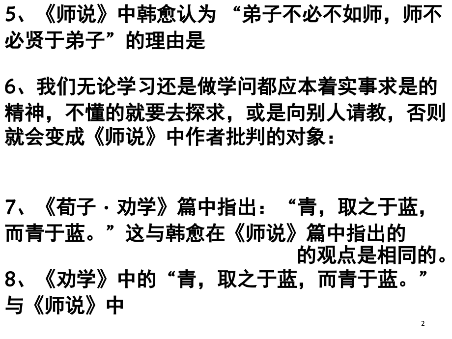 单击此处编辑母版标题样式,单击此处编辑母版文本样式,第二级,第三级,第四级,第五级,*,*,师说,中理解性默写的名句训练,1,、,师说,中陈述教师职责的句子是:,2,、,师说,中陈述择师标准的句子是:,3,、,师说,中士大夫之族耻学于师的原因:,4,、,师说,中阐述师生间辩证关系的句子是:,1,5,、,师说,中韩愈认为“弟子不必不如师,师不必贤于弟子”的理由是,6,、我们无论学习还是做学问都应本着实事求是的精神,不懂的就要去探求,或是向别人请教,否则就会变成,师说,中作者批判的对象:,7,、,荀子,劝学,篇中指出:“青,取之于蓝,而青于蓝。”这与韩愈在,师说,篇中指出的,的观点是相同的。,8,、,劝学,中的“青,取之于蓝,而青于蓝。”与,师说,中,2,9,、韩愈认为择师的标准是:,10,、韩愈眼中的师生关系是怎样的:,11,、,师说,中士大夫之族耻学于师的原因:,12,、唐代古文运动的倡导者韩愈在,师说,中,对当时耻于学习的现象发出两句慨叹:,师道之不传也久矣,欲人之无惑也难矣,,其中,“久”字写出了当时耻师现象已成陋习,“难”字写出了从师学习的重要性。,3,13,、,师说,一文通过“古之圣人”与“今之众人”对比,批判了,“今之众人,其下圣人也亦远矣,而耻学于师,”,的错误态度。,14,、韩愈在,师说,中写道,时人在从师学习的问题上,对其子和对自身有不同的态度,对其子,“择师而教之”,;对自身,“则耻师焉”,。,15,、,师说,中,士大夫之族以地位官职为借口拒绝从师学习的语句是:,16,、韩愈在,师说,中慨叹,因士大夫之族与巫医乐师百工之人对待从师学习的态度不同,产生了一种出人意料的结果:,4,师说,中理解性默写的名句训练,1,、,师说,中陈述教师职责的句子是:,2,、,师说,中陈述择师标准的句子是:,3,、,师说,中士大夫之族耻学于师的原因:,4,、,师说,中阐述师生间辩证关系的句子是:,师者,所以传道受业解惑也,是故无贵无贱,无长无少,道之所存,师之所存也。,彼与彼年相若也,道相似也,位卑则足羞,官盛则近谀。,是故弟子不必不如师,师不必贤于弟子,闻道有先后,术业有专攻,如是而已。,5,5,、,师说,中韩愈认为“弟子不必不如师,师不必贤于弟子”的理由是,6,、我们无论学习还是做学问都应本着实事求是的精神,不懂的就要去探求,或是向别人请教,否则就会变成,师说,中作者批判的对象:,7,、,荀子,劝学,篇中指出:“青,取之于蓝,而青于蓝。”这与韩愈在,师说,篇中指出的,的观点是相同的。,8,、,劝学,中的“青,取之于蓝,而青于蓝。”与,师说,中,“,闻道有先后,术业有专攻”。,“句读之不知,惑之不解,或师焉,或否焉,吾未见其明也。”,“弟子不必不如师,师不必贤于弟子”,“师不必贤于弟子,弟子不必不如师”,的观点是相同的。,6,9,、韩愈认为择师的标准是:,10,、韩愈眼中的师生关系是怎样的:,11,、,师说,中士大夫之族耻学于师的原因:,12,、唐代古文运动的倡导者韩愈在,师说,中,对当时耻于学习的现象发出两句慨叹:,师道之不传也久矣,欲人之无惑也难矣,,其中,“久”字写出了当时耻师现象已成陋习,“难”字写出了从师学习的重要性。,是故无贵无贱,无长无少,道之所存,师之所存也。,是故弟子不必不如师,师不必贤于弟子,闻道有先,后,术业有专攻,如是而已。,彼与彼年相若也,道相似也,位卑则足羞,官盛则近谀。,师道之不传也久矣,欲人之无惑也难矣,,7,13,、,师说,一文通过“古之圣人”与“今之众人”对比,批判了,“今之众人,其下圣人也亦远矣,而耻学于师,”,的错误态度。,14,、韩愈在,师说,中写道,时人在从师学习的问题上,对其子和对自身有不同的态度,对其子,“择师而教之”,;对自身,“则耻师焉”,。,15,、,师说,中,士大夫之族以地位官职为借口拒绝从师学习的语句是:,16,、韩愈在,师说,中慨叹,因士大夫之族与巫医乐师百工之人对待从师学习的态度不同,产生了一种出人意料的结果:,“今之众人,其下圣人也亦远矣,而耻学于师,”,“择师而教之”,“则耻师焉”,位卑则足羞,官盛则近谀。,“巫医乐师百工之人,君子不齿,今其智乃反不能及,其可怪也欤!”,8,