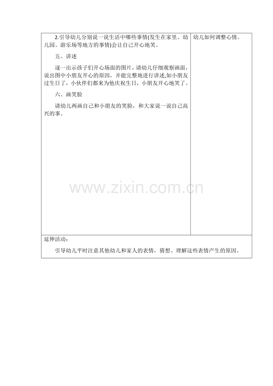 请幼儿两画自己和小朋友的笑脸,和大家说一说自己高兴的事。