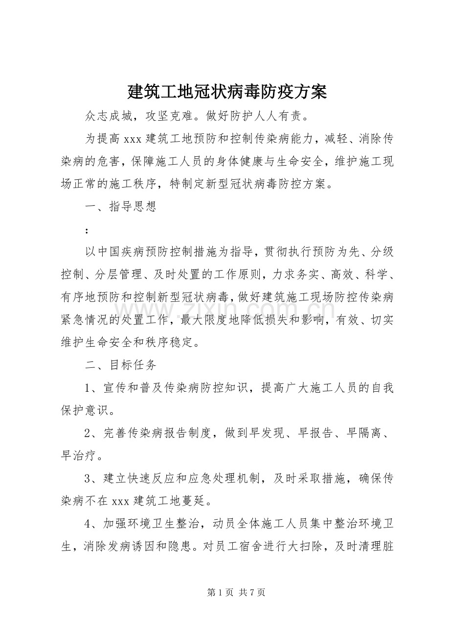 为提高xxx建筑工地预防和控制传染病能力,减轻、消除传染病的危害,保障施工人员的身体健康与生命安全,维护施工现场正常的施工秩序,特制定新型冠状病毒防控方案。