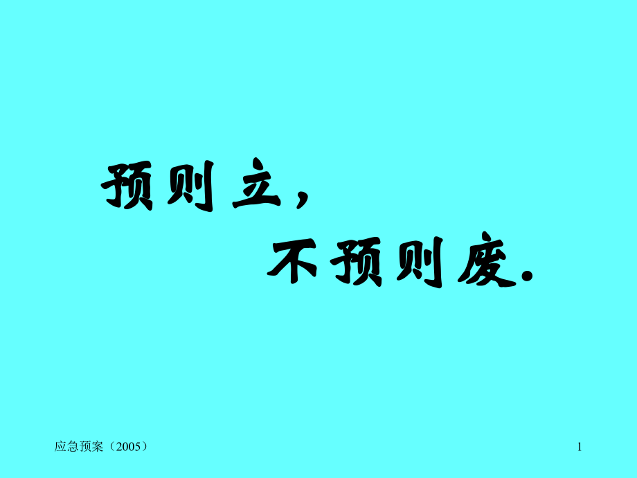 单击此处编辑母版标题样式,单击此处编辑母版文本样式,第二级,第三级,第四级,第五级,应,*,重大事故应急救援体系与应急救援预案(计划)编制,教 程,0,应,1,预则立,不预则废,.,应急预案(2005),2,一、突发公共事件的分类,突发公共卫生事故,事故灾害,突发社会安全事故,自然灾害,洪灾、台风、泥石流、地震,等气象灾害和地质灾害,工矿企业、交通运输等各类,重特大事故,各类重大传染病疫情(鼠疫、非,典等)食物中毒、动物疫情等,重大刑事案件、恐怖事件、经济,安全事件、群体性时间等,突,发,公,共,事,件,应急预案(2005),3,二、应急救援体系的分类,按突发事件性质进行体系分类,自然灾害,应急救援体系,综合应急体系,事故灾难,应急救援体系,公共卫生,应急救援体系,社会安全,应急救援体系,应急预案(2005),4,三、事故应急救援的法规要求,中华人民共和国安全生产法,第,17,条规定:生产经营单位的主要负责人有组织制定并实施本单位的生产安全事故应急救援预案的职责;第,33,条规定:生产经营单位对重大危险源应当制定应急预案;第,68,条规定:县级以上人民政府应当组织制定本行政区域内特大生产安全事故应急救援预案,建立应急救援体系;第,69,条规定:危险物品的生产、经营、储存单位以及矿山、建筑施工单位应当建立应急救援组织并配备应急救援器材、设备。,危险化学品安全管理条例,第,49,条规定:县级以上人民政府负责危险化学品安全监督管理综合工作的部门会同有关部门制定危险化学品事故应急救援预案。,国务院关于特大安全事故行政责任追究的规定,第,7,条规定:市(地、州)、(市、区)人民政府必须制定本地区特大安全事故应急处理预案。,中华人民共和国职业病防治法,第,19,条规定:用人单位应当建立、健全职业病危害事故应急救援预案。,中华人民共和国消防法,规定:消防安全重点单位应当制定灭火和应急疏散预案。,特种设备安全监察条例,第,31,条规定:特种设备使用单位应当制定事故应急措施和救援预案。,建设工程安全生产管理条例,第,47,条规定:县级以上人民政府建设行政主管部门应当制定本行政区域内建设工程特大生产安全事故应急救援预案;第,48,条规定:施工单位应当制定本单位安全事故应急救援预案;第,49,条规定:施工单位应当制定现场生产安全事故应急救援预案,总承包单位统一组织编制生产安全事故应急救援预案。,应急预案(2005),5,三、事故应急救援的法规要求,应急救援相关法规一览表破坏性地震应急条例突发公共卫生事件应急条例核电厂核事故应急管理条例核电厂核事故应急演习管理规定核事故医学应急管理规定化学事故应急救援管理办法铁路行车事故救援规定民航运输机应急救援规则,安全生产事故应急救援条例,应急预案(2005),6,四、事故应急救援管理包含的四阶段内容,预防,恢复,准备,响应,应急预案(2005),7,事故应急救援管理四阶段工作内容,阶 段,工 作 内 容,预防阶段:,为预防、控制和消除事故对人类生命财产长期危害所采取的行动(无论事故是否发生,企业和社会都处于风险之中),风险辩识、评价与控制,安全规划,安全研究,安全法规、标准制定,危险源监测监控,事故灾害保险,税收激励和强制性措施等,准备阶段:,事故发生之前采取的各种行动,目的是提高事故发生时的应急行动能力,制定应急救援方针与原则,应急救援工作机制,编制应急救援预案,应急救援物资、装备筹备,应急救援培训、演习,签定应急互助协议,应急救援信息库等,应急预案(2005),8,事故应急救援管理四阶段工作内容,阶 段,工 作 内 容,响应阶段:,事故即将发生前、发生期间和发生后立即采取的行动。目的是保护人员的生命、减少财产损失、控制和消除事故。,启动相应的应急系统和组织,报告有关政府机构,实施现场指挥和救援,控制事故扩大并消除,人员疏散和避难,环境保护和监测,现场搜寻和营救等,恢复阶段:,事故后,使生产、生活恢复到正常状态或得到进一步的改善。,损失评估,理赔,清理废墟,灾后重建,应急预案复查,事故调查,应急预案(2005),9,五、事故应急救援的基本原则,预防为主、,统一指挥、,分级负责、,区域为主、,单位自救、,社会救援。,相结合,统一领导、分级管理、条块结合、以块为主。,应急预案(2005),10,六、事故应急救援的基本任务,(防灾、减灾、救灾、恢复),做好日常的危害辩识、评价和监控工作,制定各项制度规程,提高风险管理水平(事故预防),开展预案编制、培训、宣传、演习、应急救援物资装备贮备等 工作(应急准备),指导群众防护,组织群众撤离(应急疏散),抢救受害人员(应急救援),控制危险源,减少损失(应急抢险),做好现场清理,消除危害后果(应急恢复),查清事故原因,估算危害程度(事故调查),事故预防、应急准备、控制事态发展、保障生命财产安全、恢复 正常状态,应急预案(2005),11,七、事故应急救援体系应包含的内容,应急救援体系,组织体制,运作机制,法律基础,保障系统,管理机构,功能部门,指挥中心,救援队伍,统一指挥,分级响应,属地为主,公众动员,紧急状态法,标准,政府文件,应急条例,财务经费,人力资源,物资装备,信息通讯,应急预案(2005),12,八、事故应急救援系统设计,事故应急救援预案设计,事故应急救援组织机构,(功能部门)设计,1.,设立何种组织机构(功能部门),2.,确定各组织机构(功能部门)在,应急救援中的职责、