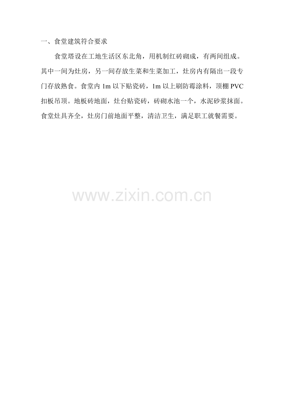 食堂塔设在工地生活区东北角,用机制红砖砌成,有两间组成。其中一间为灶房,另一间存放生菜和生菜加工,灶房内有隔出一段专门存放熟食。食堂内1m以下贴瓷砖,1m以上刷防霉涂料,顶棚PVC扣板吊顶。地板砖地面,灶台贴瓷砖,砖砌水池一个,水泥砂浆抹面。食堂灶具齐全,灶房门前地面平整,清洁卫生,满足职工就餐需要。