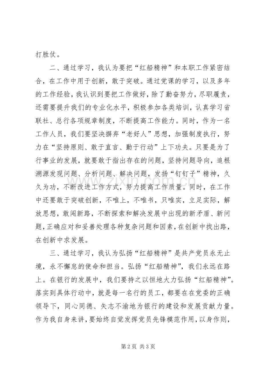 三、通过学习,我认为弘扬“红船精神”是共产党员永无止境,永不懈怠的使命和担当。弘扬“红船精神”,我们永远在路上。在银行的发展中,我们要持之以恒地大力弘扬“红船精神”。落实到具体行动中,就是每一名行的员工,都要在在党委的正确领导下,同心同德、矢志不渝地为银行的建设和发展贡献力量。作为我自身来讲,要始终自觉发挥党员先锋模范作用,以身作则,率先垂范,自觉强化事业心和责任感,以昂扬向上的蓬勃朝气,真抓实干的风发意气,自觉把“红船精神”落实到工作中的点点滴滴。