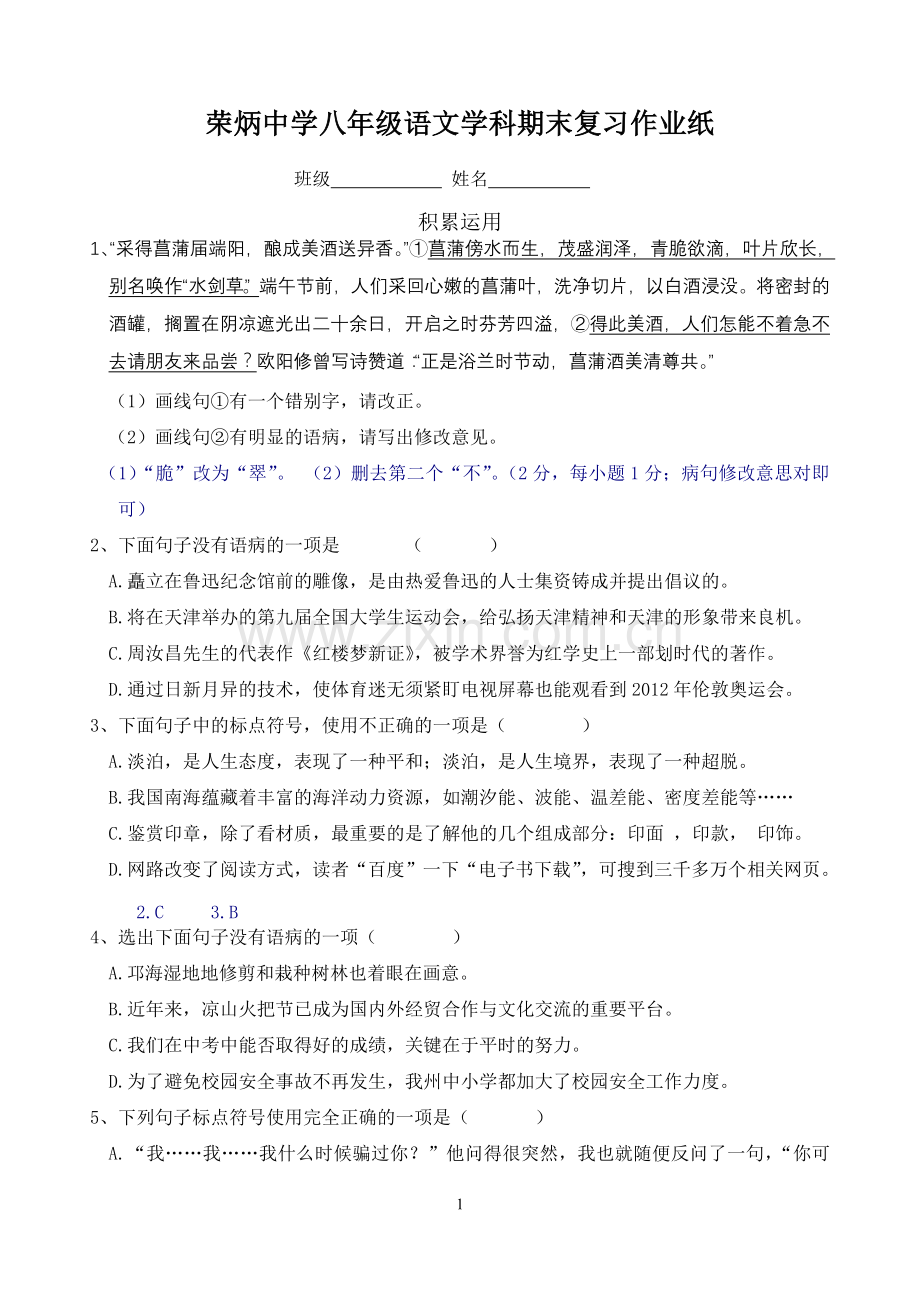 (1)“脆”改为“翠”。 (2)删去第二个“不”。(2分,每小题1分;病句修改意思对即可)
