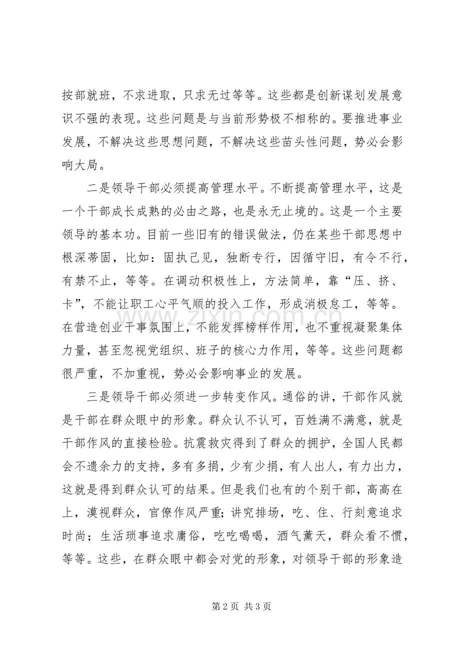 三是领导干部必须进一步转变作风。通俗的讲,干部作风就是干部在群众眼中的形象。群众认不认可,百姓满不满意,就是干部作风的直接检验。抗震救灾得到了群众的拥护,全国人民都会不遗余力的支持,多有多捐,少有少捐,有人出人,有力出力,这就是得到群众认可的结果。但是我们也有的个别干部,高高在上,漠视群众,官僚作风严重;讲究排场,吃、住、行刻意追求时尚;生活琐事追求庸俗,吃吃喝喝,酒气薰天,群众看不惯,等等。这些,在群众眼中都会对党的形象,对领导干部的形象造成严重影响。平常时,群众睁一只眼,闭一只眼,但到关键时刻问题都会一股脑的涌出来,到那时再去解决可就事倍功半了,“6.28瓮安事件”就是典型的例子。所以,各级领导干部都要谨言慎行,戒骄戒躁。