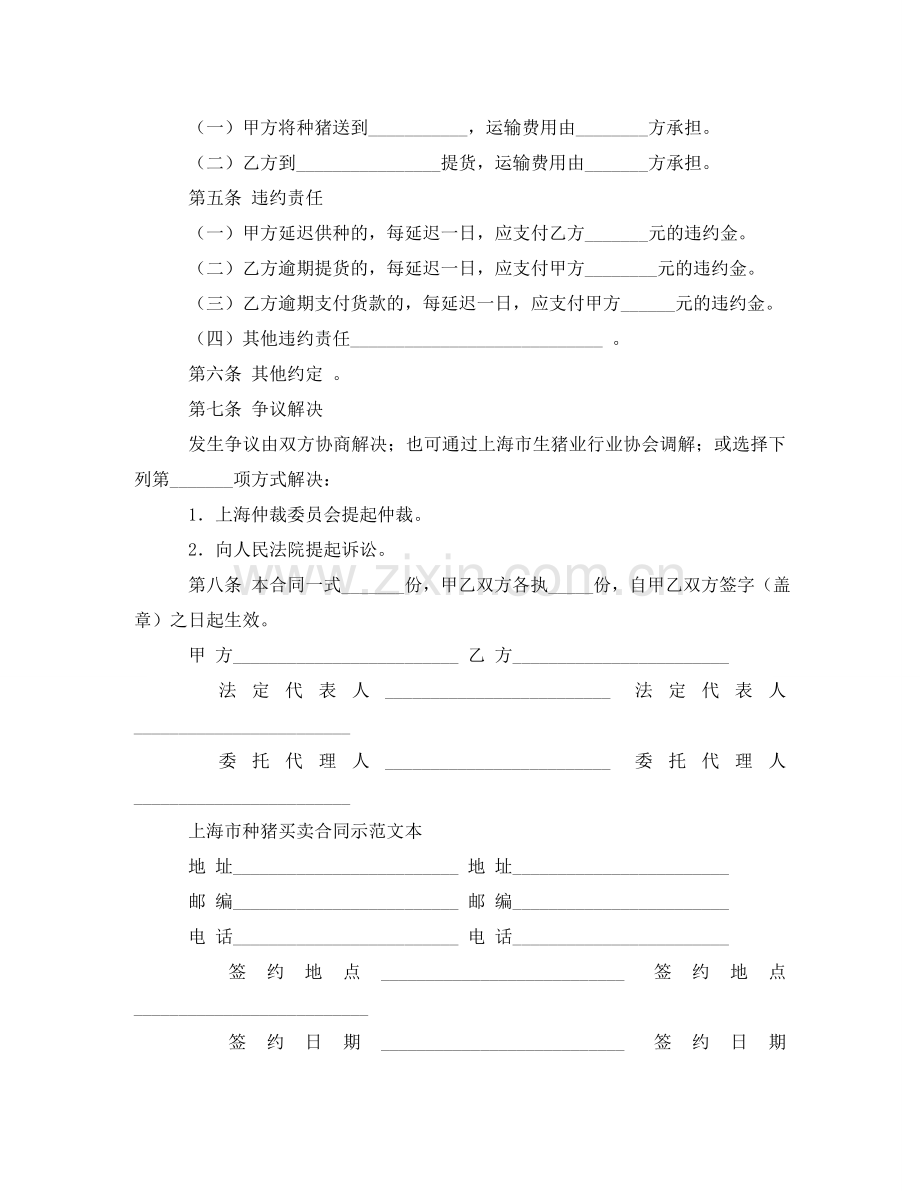 (二)合同签订后,乙方支付甲方定金_______元,乙方每批提货时须付讫所提该批种猪的金额,定金抵作货款或返还。