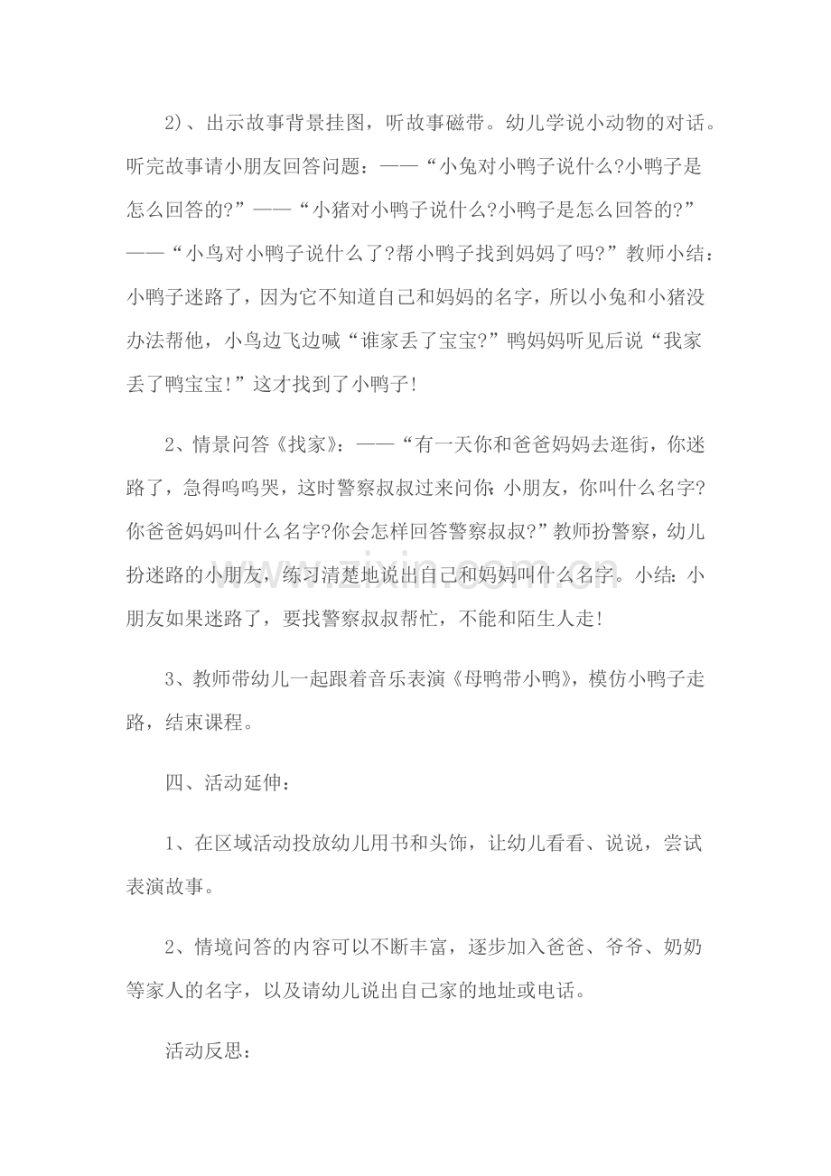 2)、出示故事背景挂图,听故事磁带。幼儿学说小动物的对话。听完故事请小朋友回答问题:——“小兔对小鸭子说什么?小鸭子是怎么回答的?”——“小猪对小鸭子说什么?小鸭子是怎么回答的?”——“小鸟对小鸭子说什么了?帮小鸭子找到妈妈了吗?”教师小结:小鸭子迷路了,因为它不知道自己和妈妈的名字,所以小兔和小猪没办法帮他,小鸟边飞边喊“谁家丢了宝宝?”鸭妈妈听见后说“我家丢了鸭宝宝!”这才找到了小鸭子!