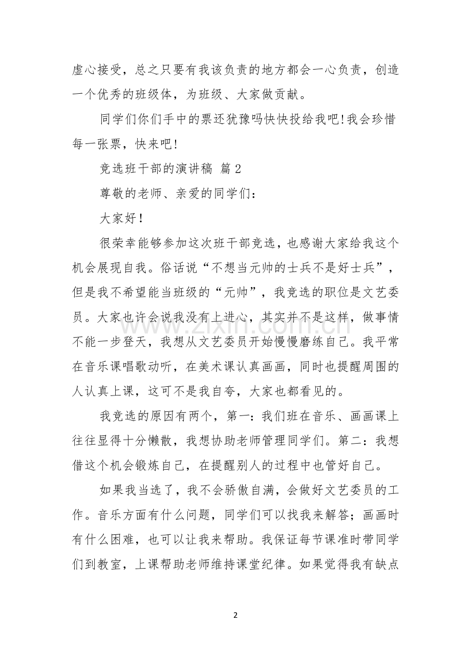 很荣幸能够参加这次班干部竞选,也感谢大家给我这个机会展现自我。俗话说“不想当元帅的士兵不是好士兵”,但是我不希望能当班级的“元帅”,我竞选的职位是文艺委员。大家也许会说我没有上进心,其实并不是这样,做事情不能一步登天,我想从文艺委员开始慢慢磨练自己。我平常在音乐课唱歌动听,在美术课认真画画,同时也提醒周围的人认真上课,这可不是我自夸,大家也都看见的。