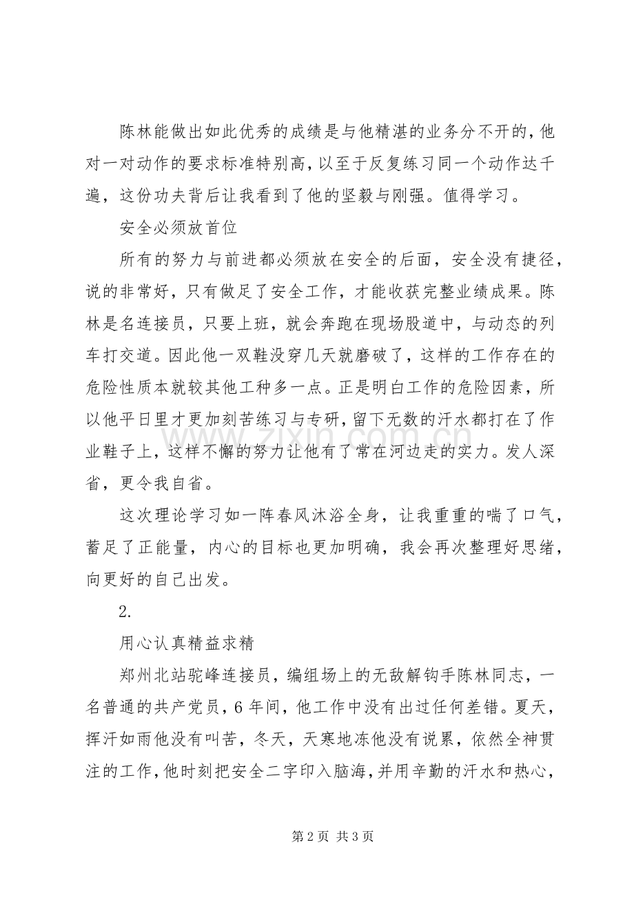 郑州北站驼峰连接员,编组场上的无敌解钩手陈林同志,一名普通的共产党员,6年间,他工作中没有出过任何差错。夏天,挥汗如雨他没有叫苦,冬天,天寒地冻他没有说累,依然全神贯注的工作,他时刻把安全二字印入脑海,并用辛勤的汗水和热心,解决了工作中一道又一道难题。他这样工作靠的是什么。靠的是坚定的政治思想,靠的是思想重视和对工作的极端热情,靠的是努力学习,勤奋思考,靠的是用心专研和工作中的精益求精,他把每天枯燥的重复动作做好做细,干出了平凡工作中不平凡的业绩,为我们每一名铁路职工树立了光辉榜样,这是非常值得我们学习的。