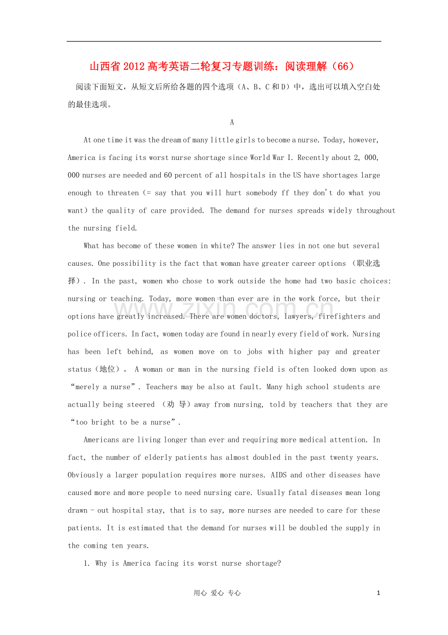 山西省2012高考英语二轮复习专题训练:阅读理解(66)