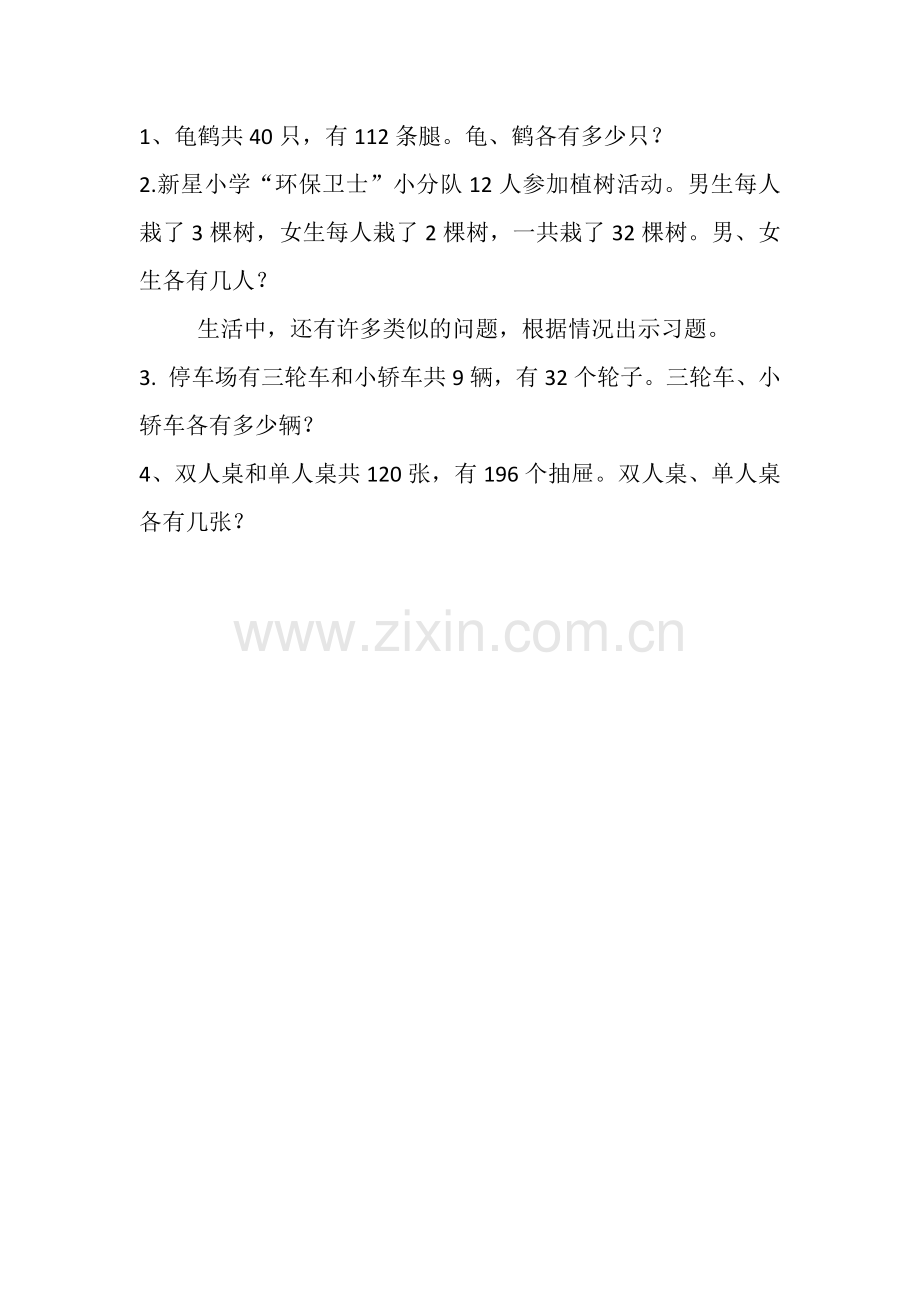 1、龟鹤共40只,有112条腿。龟、鹤各有多少只? 2.新星小学“环保卫士”小分队12人参加植树活动。男生每人 栽了3棵树,女生每人栽了2棵树,一共栽了32棵树。男、女 生各有几人? 生活中,还有许多类似的问题,根据情况出示习题。 3. 停车场有三轮车和小轿车共9辆,有32个轮子。三轮车、小轿车各有多少辆? 4、双人桌和单人桌共120张,有196个抽屉。双人桌、单人桌各有几张?