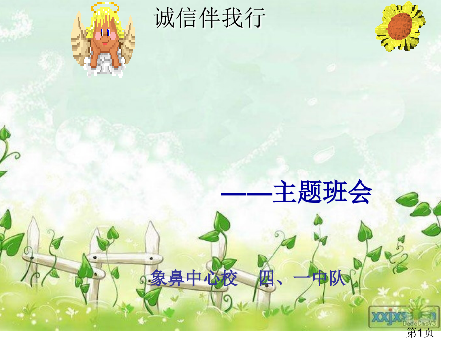 单击此处编辑母版标题样式,单击此处编辑母版文本样式,第二级,第三级,第四级,第五级,*,本资料仅供参考,不能作为科学依据。谢谢,诚信伴我行,主题班会,象鼻中心校 四、一中队,第1页,什么是诚信?,第2页,诚 信,诚,-,忠诚老实、实事求是,信,-,言而有信、信守承诺,老实守信,第3页,我有一个讲诚信妈妈。小时候,她告诉我说:“孩子,等你长大了,我教你翱翔。”现在,我长大了,妈妈信守承诺教会我飞了。瞧,现在我飞得多高呀!,可我有一个不老实妹妹。那次明明是她偷吃了妈妈买零食,她却硬说是我偷吃了。我可委屈了!,我们与诚信小事,第4页,诚信是金,?,第5页,有一个年轻人走在漫长人生道路上,到了一个渡口时候,他已经拥有了“健康”、“美貌”、“诚信”、“机敏”、“才学”、“金钱”、“荣誉”七个背包。船到江心,突然风起浪涌,小船上下颠动起来。艄公说:“船小负载重,客官必须丢弃一个背包方可安渡难关。”年轻人哪一个都不舍得丢,思索了一会儿,把“诚信”丢进了水里。现在,这位年轻人带着他剩下六个背包,来到了某银行应聘,假如你就是负责招聘该银行主管,你想不想让他成为你们单位一员?,第6页,为何年轻人拥有这么多,这么好条件,却还是找不到一份工作呢?,第7页,诚信是一个人安身立命基础,是一个人立足社会通行证,是一个人生存和发展主要条件,是我们做人基本准则、立身之本,是人生最主要财富。,诚信是立身之本,第8页,(,1,)为何卖鱼商贩天天能吸引来那么多用户呢?,(,2,)卖鱼商贩未来有怎样发展前途呢?,诚信是交往之道,第9页,含有诚信品德,坚持诚信做事,才会取得信任和尊重,才能形成交往和合作,才能享受信誉和成功。诚信是交往之道。,诚信是交往之道,第10页,诚信,就个人而言,是高尚人格力量,;,就社会而言,是保障有序发展通行证。,诚信是社会通行证,第11页,假如你同学、老师、父母、警察、司机、医生,不正直、不老实,结果会怎样?,不信请看,第12页,平安离不开诚信!,第13页,生命离不开诚信!,第14页,妈妈品行不好,教孩子撒谎,占他人小廉价。使孩子走向犯罪!,教育离不开诚信!,第15页,小学生守则,其中一条:,老实、勇敢、不说谎话,第16页,诚信大考验,第17页,事例:,小娟父亲参加了援藏医疗队。最近,她妈妈得了重病住进了医院。父亲来信问到家里情况,王娟不知道该不该把妈妈生病事如实地告诉父亲。,说说:她应该怎么办?,第18页,在诚信问题上有各种复杂情况,在特定交往情境中,需要善意隐瞒和坑骗这和诚信待人并不矛盾,因为诚信本质是善,善意谎言是诚信特殊表现。只要我们正确了解诚信标准与人为善,我们就能拥有诚信智慧,做一个诚信人。,明辨是非,第19页,那么我们该怎样做才能坚守诚信?,第20页,我们诚信能够这么建立,:(,供参考,),1,、在校按小学生守则做到每一点,.,2,、认真对待每一次考试,绝不照抄,;,3,、放学不再逗留,不再编谎话骗父母,;,4,、不轻言承诺,诺则一诺千金,;,5,、不做损人事,;,6,、不与人比吃穿,只比学习进步;,也能够写一句关于诚信名言古训提醒自己做一个讲诚信人,现在就定计划,培养自己,第21页,记住:诚信由你我做起,,第22页,再见,第23页,