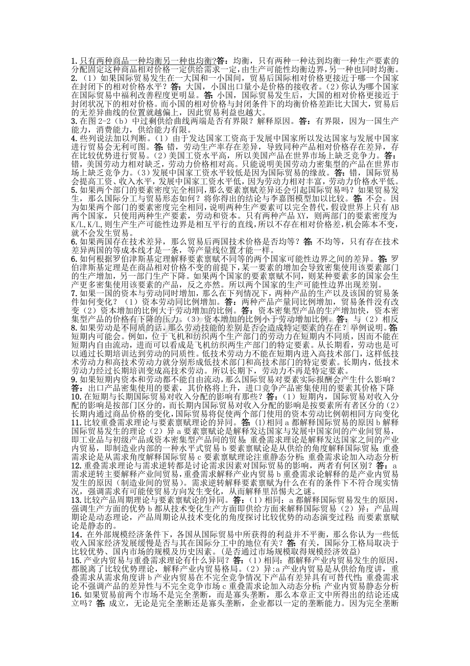 11.比较重叠需求理论与要素禀赋理论的异同。答:(1)相同a都解释国际贸易的原因b解释国际贸易发生的理论(2)异a要素禀赋论是解释发达国家与发展中国家间的产业间贸易,即工业品与初级产品或资本密集型产品间的贸易;重叠需求理论是解释发达国家之间的产业内贸易,即制造业内部的一种水平式贸易b要素禀赋论是从供给的角度解释国际贸易;重叠需求论是从需求角度解释国际贸易c要素禀赋理论注重静态分析;重叠需求论加入动态分析