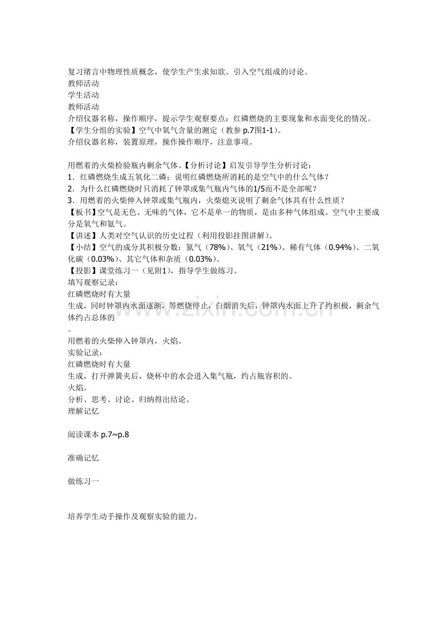 知识:通过实验,使学生了解空气的组成,并对空气的污染和防治有所认识。