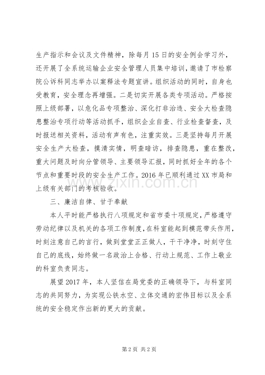 展望2017年,本人坚信在局党委的正确领导下,与科室同志的共同努力,为实现公铁水空、立体交通的宏伟目标以及全系统的安全稳定作出新的更大的贡献。